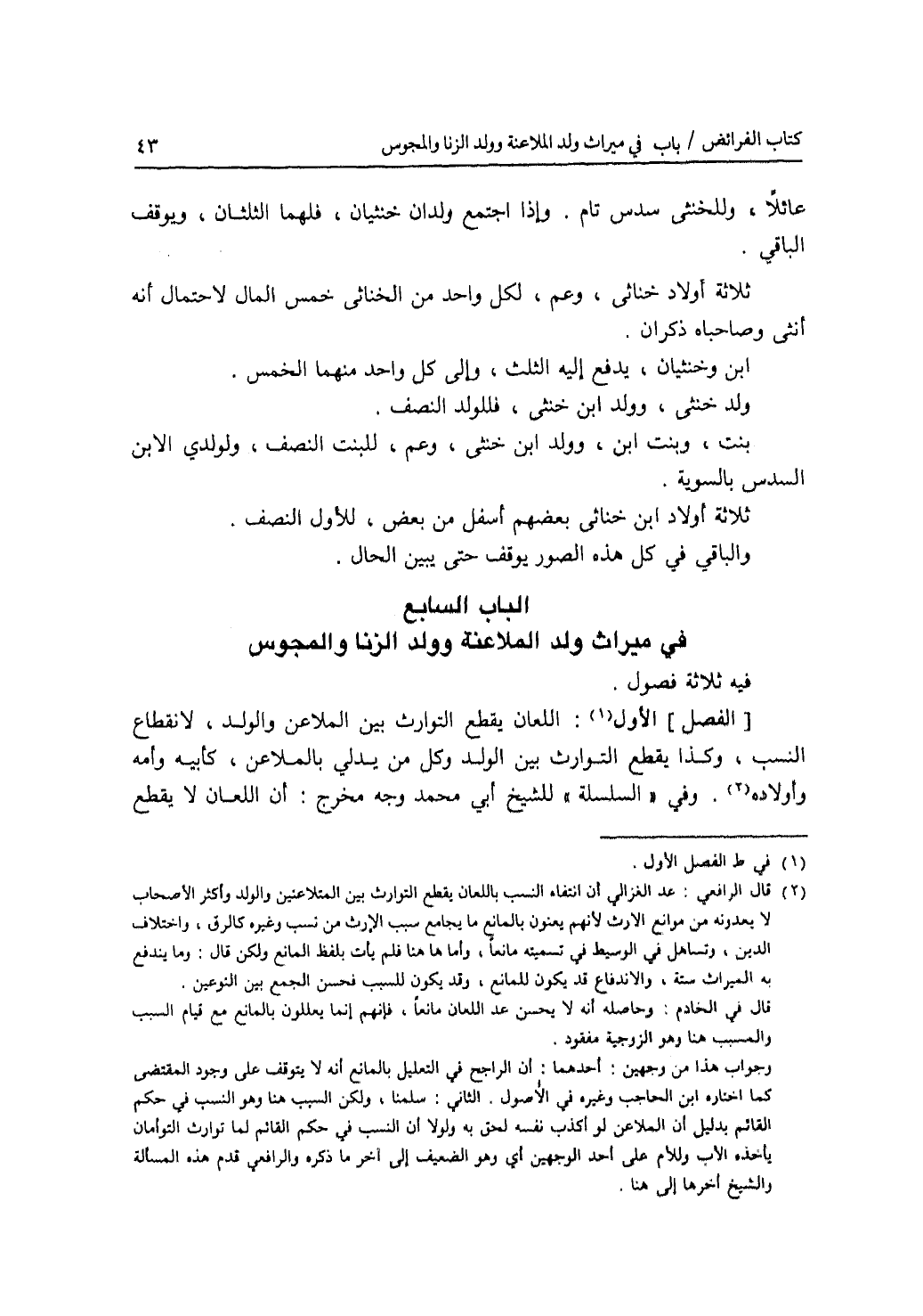 الباب السابع : في ميراث ولد الملاعنة وولد الزنا والمجوس فيه ثلاثة فصول.