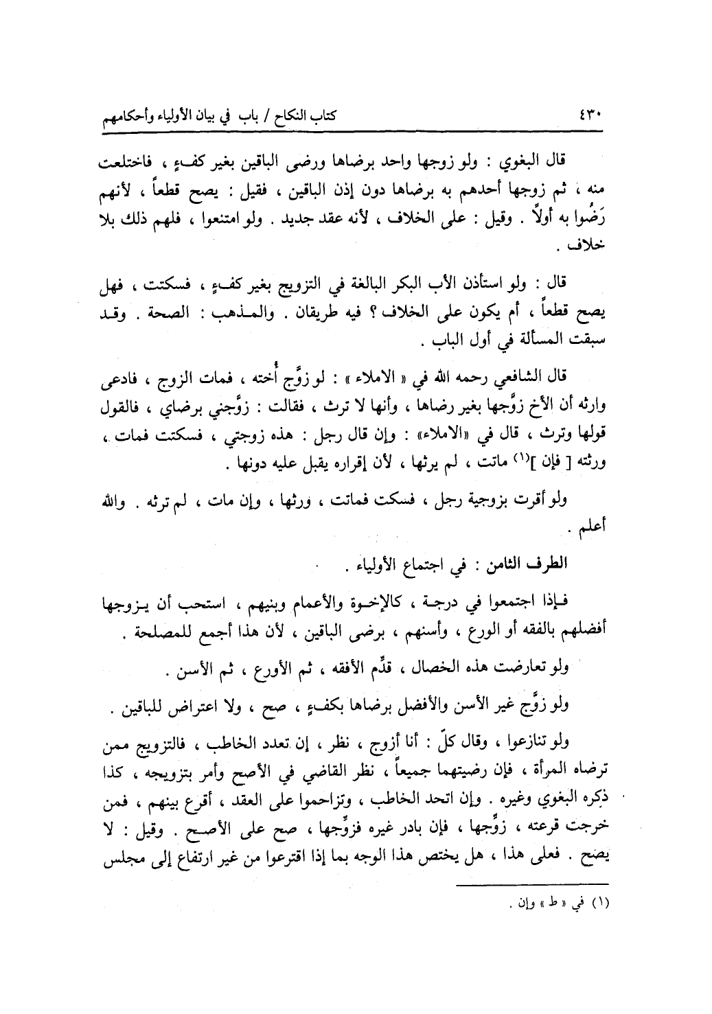 الطرف الثامن : في اجتماع الأولياء. فإذا اجتمعوا في درجة، كالاخوة والاعمام وبنيهم، استحب أن يزوجها أفضلهم بالفقه أو الورع، وأسنهم، برضى الباقين، لان هذا أجمع للمصلحة. ولو تعارضت هذه الخصال، قدم الافقه، ثم الاورع، ثم الاسن. ولو زوج غير الاسن والافضل برضاها بكف ء، صح، ولا اعتراض للباقين. ولو تنازعوا، وقال كل: أنا أزوج، نظر، إن تعدد الخاطب، فالتزويج ممن ترضاه المرأة، فإن رضيتهما جميعا، نظر القاضي في الاصلح وأمر بتزويجه، كذا ذكره البغوي وغيره. وإن اتحد الخاطب، وتزاحموا على العقد، أقرع بينهم، فمن خرجت قرعته، زوجها، فإن بادر غيره فزوجها، صح على الاصح. وقيل: لا يصح. فعلى هذا، هل يختص هذا الوجه بما إذا اقترعوا من غير ارتفاع إلى مجلس
