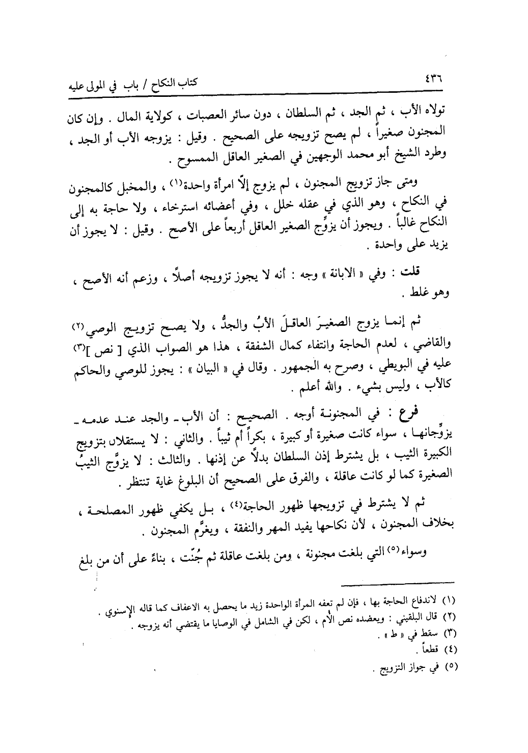 تولاه الاب، ثم الجد، ثم السلطان، دون سائر العصبات، كولاية المال. وإن كان المجنون صغيرا، لم يصح تزويجه على الصحيح. وقيل: يزوجه الاب أو الجد، وطرد الشيخ أبو محمد الوجهين في الصغير العاقل الممسوح. ومتى جاز تزويج المجنون، لم يزوج إلا إمرأة واحدة، والمخبل كالمجنون في النكاح، وهو الذي في عقله خلل، وفي أعضائه استرخاء، ولا حاجة به إلى النكاح غالبا. ويجوز أن يزوج الصغير العاقل أربعا على الاصح. وقيل: لا يجوز أن يزيد على واحدة. قلت: وفي الابانة وجه: أنه لا يجوز تزويجه ء صلا، وزعم أنه الاصح، وهو غلط. ثم إنما يزوج الصغير العاقل الاب والجد، ولا يصح تزويج الوصي والقاضي، لعدم الحاجة وانتفاء كمال الشفقة، هذا هو الصواب الذي عليه في البويطي، وصرح به الجمهور. وقال في البيان: يجوز للوصي والحاكم كالاب، وليس بشئ. والله أعلم. فرع في المجنونة أوجه. الصحيح: أن الاب - والجد عند عدمه - يزوجانها، سواء كانت صغيرة أو كبيرة، بكرا أم ثيبا. والثاني: لا يستقلان بتزويج الكبيرة الثيب، بل يشترط إذن السلطان بدلا عن إذنها. والثالث: لا يزوج الثيب الصغيرة كما لو كانت عاقلة، والفرق على الصحيح أن البلوغ غاية تنتظر. ثم لا يشترط في تزويجها ظهور الحاجة، بل يكفي ظهور المصلحة، بخلاف المجنون، لان نكاحها يفيد المهر والنفقة، ويغرم المجنون. وسواء التي بلغت مجنونة، ومن بلغت عاقلة ثم جنت، بناء على أن من بلغ