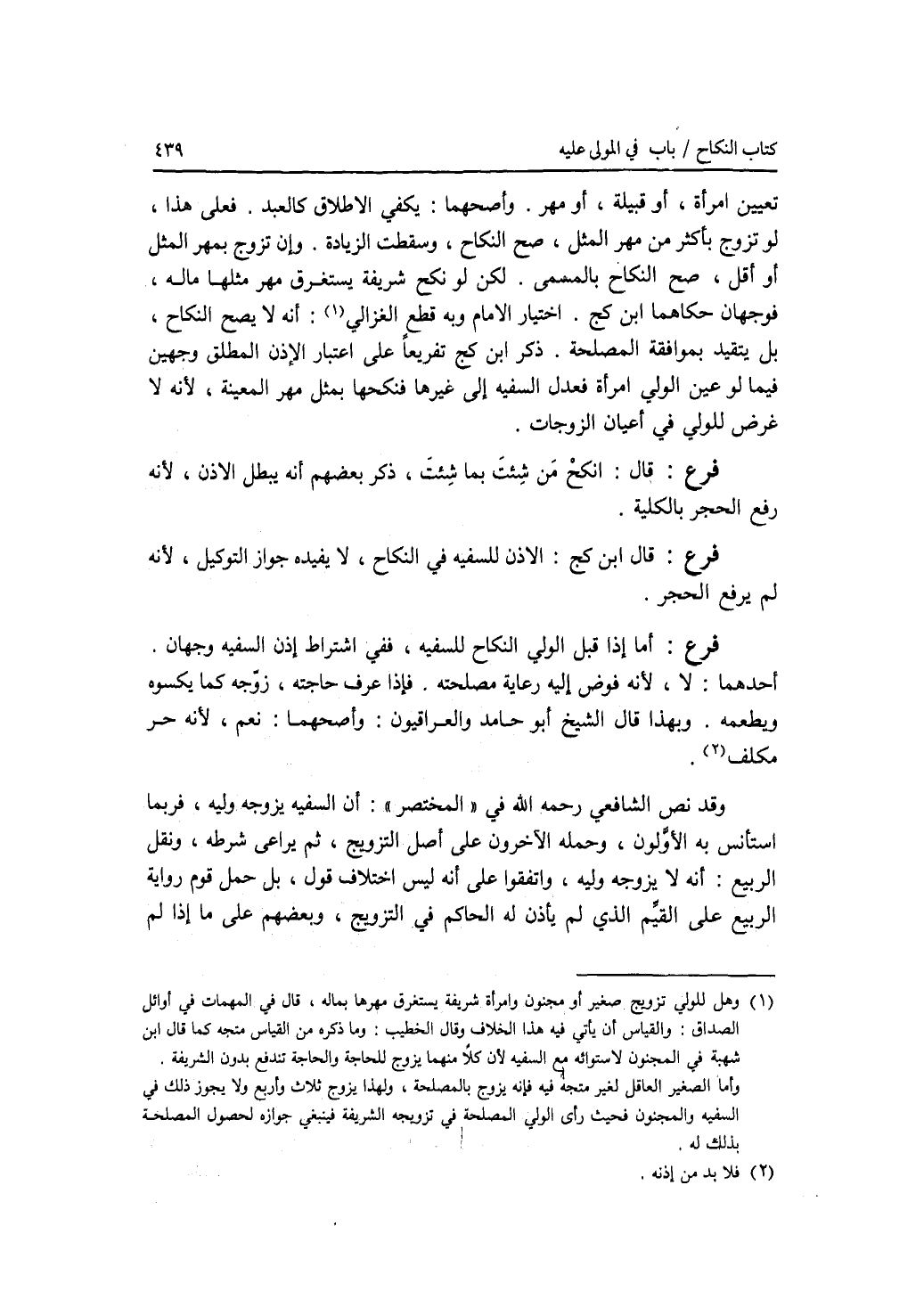 تعيين إمرأة، أو قبيلة، أو مهر. وأصحهما: يكفي الاطلاق كالعبد. فعلى هذا، لو تزوج بأكثر من مهر المثل، صح النكاح، وسقطت الزيادة. وإن تزوج بمهر المثل أو أقل، صح النكاح بالمسمى. لكن لو نكح شريفة يستغرق مهر مثلها ماله، فوجهان حكاهما ابن كج. اختيار الامام وبه قطع الغزالي: أنه لا يصح النكاح، بل يتقيد بموافقة المصلحة. ذكر ابن كج تفريعا على اعتبار الاذن المطلق وجهين فيما لو عين الولي إمرأة فعدل السفيه إلى غيرها (فنكحها) بمثل مهر المعينة، لانه لا غرض للولي في أعيان الزوجات. فرع قال: انكح من شئت بما شئت، ذكر بعضهم أنه يبطل الاذن، لانه رفع الحجر بالكلية. فرع قال ابن كج: الاذن للسفيه في النكاح، لا يفيده جواز التوكيل، لانه لم يرفع الحجر. فرع أما إذا قبل الولي النكاح للسفيه، ففي اشتراط إذن السفيه وجهان. أحدهما: لا، لانه فوض إليه رعاية مصلحته. فإذا عرف حاجته، زوجه كما يكسوه ويطعمه. وبهذا قال الشيخ أبو حامد والعراقيون. وأصحهما: نعم، لانه حر مكلف. وقد نص الشافعي رحمه الله في المختصر: أن السفيه يزوجه وليه، فربما استأنس به الاولون، وحمله الآخرون على أصل التزويج، ثم يراعى شرطه، ونقل الربيع: أنه لا يزوجه وليه، واتفقوا على أنه ليس اختلاف قول، بل حمل قوم رواية الربيع على القيم الذي لم يأذن له الحاكم في التزويج، وبعضهم على ما إذا لم