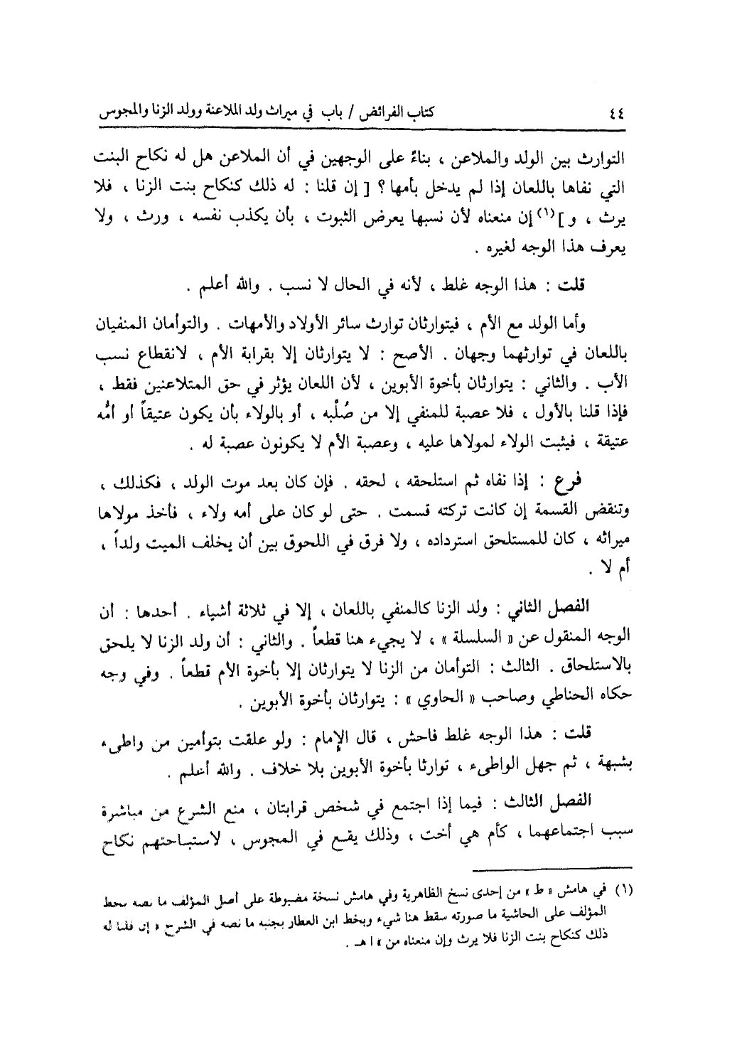 الفصل الثاني : ولد الزنا كالمنفي باللعان، إلا في ثلاثة أشياء. أحدها: أن الوجه المنقول عن السلسلة، لا يجئ هنا قطعا. والثاني: أن ولد الزنا لا يلحق بالاستلحاق. الثالث: التوأمان من الزنا لا يتوارثان إلا بأخوة الام قطعا. وفي وجه حكاه الحناطي وصاحب الحاوي: يتوارثان بأخوة الابوين. قلت: هذا الوجه غلط فاحش، قال الامام: ولو علقت بتوأمين من واطئ بشبهة، ثم جهل الواطئ، توارثا بأخوة الابوين بلا خلاف. والله أعلم.