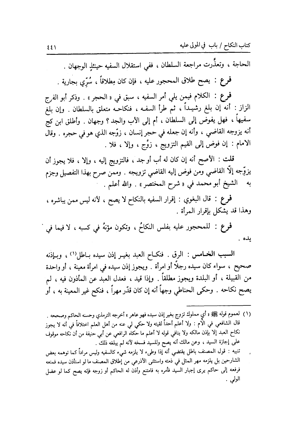 الحاجة، وتعذرت مراجعة السلطان، ففي استقلال السفيه حينئذ الوجهان. فرع يصح طلاق المحجور عليه، فإن كان مطلاقا، سري بجارية. فرع الكلام فيمن يلي أمر السفيه، سبق في الحجر. وذكر أبو الفرج الزاز: أنه إن بلغ رشيدا، ثم طرأ السفه، فنكاحه متعلق بالسلطان. وإن بلغ سفيها، فهل يفوض إلى السلطان، أم إلى الاب والجد ؟ وجهان. وأطلق ابن كج أنه يزوجه القاضي، وأنه إن جعله في حجر إنسان، زوجه الذي هو في حجره. وقال الامام: إن فوض إلى القيم التزويج، زوج، وإلا، فلا. قلت: الاصح أنه إن كان له أب أو جد، فالتزويج إليه، وإلا، فلا يجوز أن يزوجه إلا القاضي ومن فوض إليه القاضي تزويجه. وممن صرح بهذا التفصيل وجزم به، الشيخ أبو محمد في شرح المختصر. والله أعلم. فرع قال البغوي: إقرار السفيه بالنكاح لا يصح، لانه ليس ممن يباشره، وهذا قد يشكل بإقرار المرأة. فرع للمحجور عليه بفلس النكاح، وتكون مؤنه في كسبه، لا فيما في يده. السبب الخامس: الرق. فنكاح العبد بغير إذن سيده باطل، وبإذنه صحيح، سواء كان سيده رجلا أو إمرأة. ويجوز إذن سيده في إمرأة معينة، أو واحدة من القبيلة، أو البلدة، ويجوز مطلقا. وإذا قيد، فعدل العبد عن المأذون فيه، لم يصح نكاحه. وحكى الحناطي وجها أنه إن كان قدر مهرا، فنكح غير المعينة به، أو