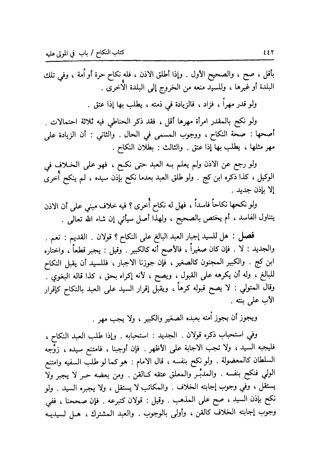بأقل، صح، والصحيح الاول. وإذا أطلق الاذن، فله نكاح حرة أو أمة، وفي تلك البلدة أو غيرها، وللسيد منعه من الخروج إلى البلدة الاخرى. ولو قدر مهرا، فزاد، فالزيادة في ذمته، يطلب بها إذا عتق. ولو نكح بالمقدر إمرأة مهرها أقل، فقد ذكر الحناطي فيه ثلاثة إحتمالات. أصحها: صحة النكاح، ووجوب المسمى في الحال. والثاني: أن الزيادة على مهر مثلها، يطلب بها إذا عتق. والثالث: بطلان النكاح. ولو رجع عن الاذن ولم يعلم به العبد حتى نكح، فهو على الخلاف في الوكيل، كذا ذكره ابن كج. ولو طلق العبد بعدما نكح بإذن سيده، لم ينكح أخرى إلا بإذن جديد. ولو نكحها نكاحا فاسدا، فهل له نكاح أخرى ؟ فيه خلاف لبني على أن الاذن يتناول الفاسد، أم يختص بالصحيح، ولهذا أصل سيأتي إن شاء الله تعالى.