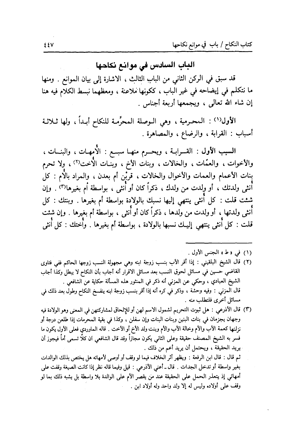 الجنس الأول : المحرمية، وهي الوصلة المحرمة للنكاح أبدا، ولها ثلاثة أسباب: القرابة، والرضاع، والمصاهرة. السبب الاول: القرابة، ويحرم منها سبع: الامهات، والبنات، والاخوات، والعمات، والخالات، وبنات الاخ، وبنات الاخت، ولا تحرم بنات الاعمام والعمات والاخوال والخالات، قربن أم بعدن، والمراد بالام: كل أنثى ولدتك، أو ولدت من ولدك، ذكرا كان أو أنثى، بواسطة أم بغيرها. وإن شئت قلت: كل أنثى ينتهي إليها نسبك بالولادة بواسطة أم بغيرها. وبنتك: كل أنثى ولدتها، أو ولدت من ولدها، ذكرا كان أو أنثى، بواسطة أم بغيرها. وإن شئت قلت: كل أنثى ينتهي إليك نسبها بالولادة، بواسطة أم بغيرها. وأختك: كل أنثى