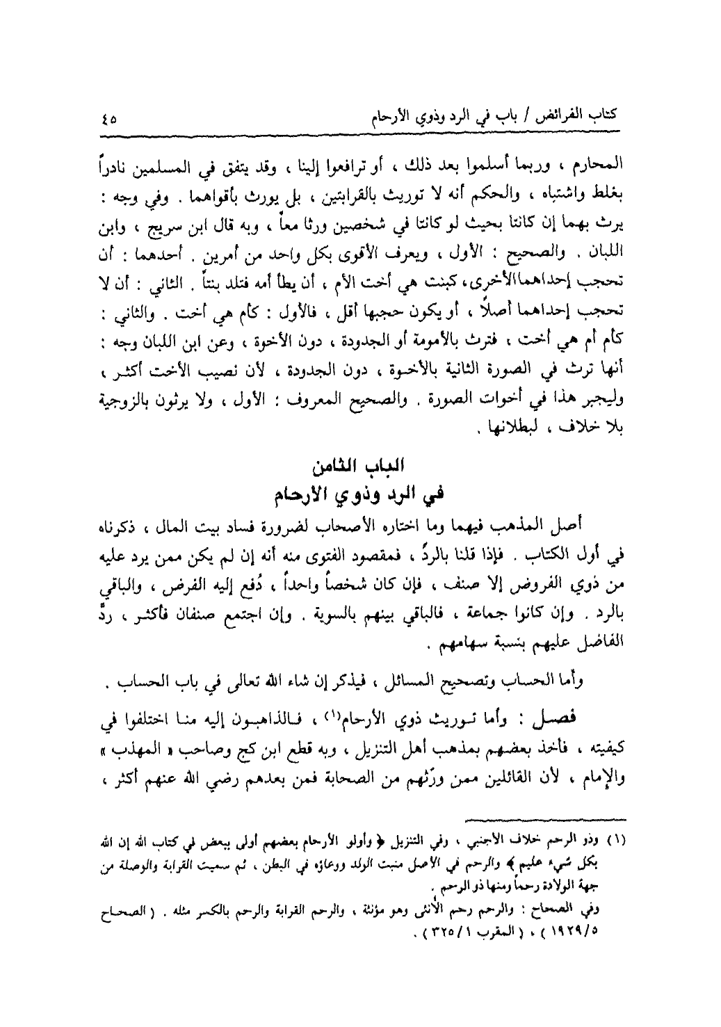 الباب الثامن : في الرد وذوي الأرحام أصل المذهب فيهما وما اختاره الاصحاب لضرورة فساد بيت المال، ذكرناه في أول الكتاب. فإذا قلنا بالرد، فمقصود الفتوى منه أنه إن لم يكن ممن يرد عليه من ذوي الفروض إلا صنف، فإن كان شخصا واحدا، دفع إليه الفرض، والباقي بالرد. وإن كانوا جماعة، فالباقي بينهم بالسوية. وإن اجتمع صنفان فأكثر، رد الفاضل عليهم بنسبة سهامهم. وأما الحساب وتصحيح المسائل، فيذكر إن شاء الله تعالى في باب الحساب. فصل وأما توريث ذوي الارحام، فالذاهبون إليه منا اختلفوا في كيفيته، فأخذ بعضهم بمذهب أهل التنزيل، وبه قطع ابن كج وصاحب المهذب والامام، لان القائلين ممن ورثهم من الصحابة فمن بعدهم رضي الله عنهم أكثر،