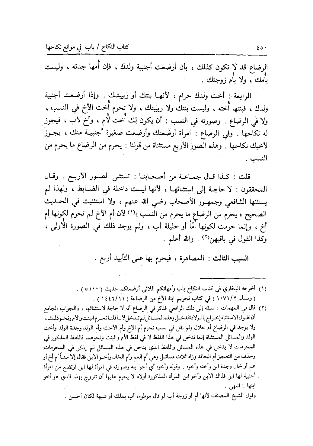 الرضاع قد لا تكون كذلك، بأن أرضعت أجنبية ولدك، فإن أمها جدته، وليست بأمك، ولا بأم زوجتك. الرابعة: أخت ولدك حرام، لانها بنتك أو ربيبتك. وإذا أرضعت أجنبية ولدك، فبنتها أخته، وليست بنتك ولا ربيبتك، ولا تحرم أخت الاخ في النسب، ولا في الرضاع. وصورته في النسب: أن يكون لك أخت لام، وأخ لاب، فيجوز له نكاحها. وفي الرضاع: إمرأة أرضعتك وأرضعت صغيرة أجنبية منك، يجوز لاخيك نكاحها. وهذه الصور الاربع مستثناة من قولنا: يحرم من الرضاع ما يحرم من النسب. قلت: كذا قال جماعة من أصحابنا: تستثنى الصور الاربع. وقال المحققون: لا حاجة إلى استثنائها، لانها ليست داخلة في الضابط، ولهذا لم يستثنها الشافعي وجمهور الاصحاب رضي الله عنهم، ولا استثنيت في الحديث الصحيح يحرم من الرضاع ما يحرم من النسب لان أم الاخ لم تحرم لكونها أم أخ، وإنما حرمت لكونها أما أو حليلة أب، ولم يوجد ذلك في الصورة الاولى، وكذا القول في باقيهن. والله أعلم. السبب الثالث: المصاهرة، فيحرم بها على التأبيد أربع.