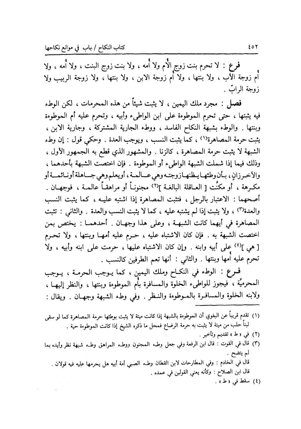 فرع لا تحرم بنت زوج الام، ولا أمه، ولا بنت زوج البنت، ولا أمه، ولا أم زوجة الاب، ولا بنتها، ولا أم زوجة الابن، ولا بنتها، ولا زوجة الربيب ولا زوجة الراب. فصل مجرد ملك اليمين، لا يثبت شيئا من هذه المحرمات، لكن الوطئ فيه يثبتها، حتى تحرم الموطوءة على ابن الواطئ وأبيه، وتحرم عليه أم الموطوءة وبنتها. والوطئ بشبهة النكاح الفاسد، والشراء الفاسد، ووطئ الجارية المشتركة، وجارية الابن، يثبت حرمة المصاهرة، كما يثبت النسب، ويوجب العدة. وحكي قول: أن وطئ الشبهة لا يثبت حرمة المصاهرة، كالزنا. والمشهور الذي قطع به الجمهور الاول، وذلك فيما إذا شملت الشبهة الواطئ (أو) الموطوءة. فإن اختصت الشبهة بأحدهما، والآخر زان، بأن وطئها يظنها زوجته وهي عالمة، أو يعلم وهي جاهلة أو نائمة أو مكرهة، أو مكنت البالغة العاقلة مجنونا أو مراهقا عالمة، فوجهان. أصحهما: الاعتبار بالرجل، فتثبت المصاهرة إذا اشتبه عليه، كما يثبت النسب والعدة، ولا يثبت إذا لم يشتبه عليه، كما لا يثبت النسب والعدة. والثاني: تثبت المصاهرة في أيهما كانت الشبهة، وعلى هذا وجهان. أحدهما: يختص بمن اختصت الشبهة به. فإن كان الاشتباه عليه، حرم عليه أمها وبنتها، ولا تحرم على أبيه وابنه. وإن كان الاشتباه عليها، حرمت على ابنه وأبيه، ولا تحرم عليه أمها وبنتها. والثاني: أنها تعم الطرفين كالنسب. فرع الوطئ في النكاح وملك اليمين، كما يوجب الحرمة، يوجب المحرمية، فيجوز للواطئ الخلوة والمسافرة بأم الموطوءة وبنتها، والنظر إليها، ولابنه الخلوة والمسافرة بالموطوءة والنظر. وفي وطئ الشبهة وجهان. ويقال: