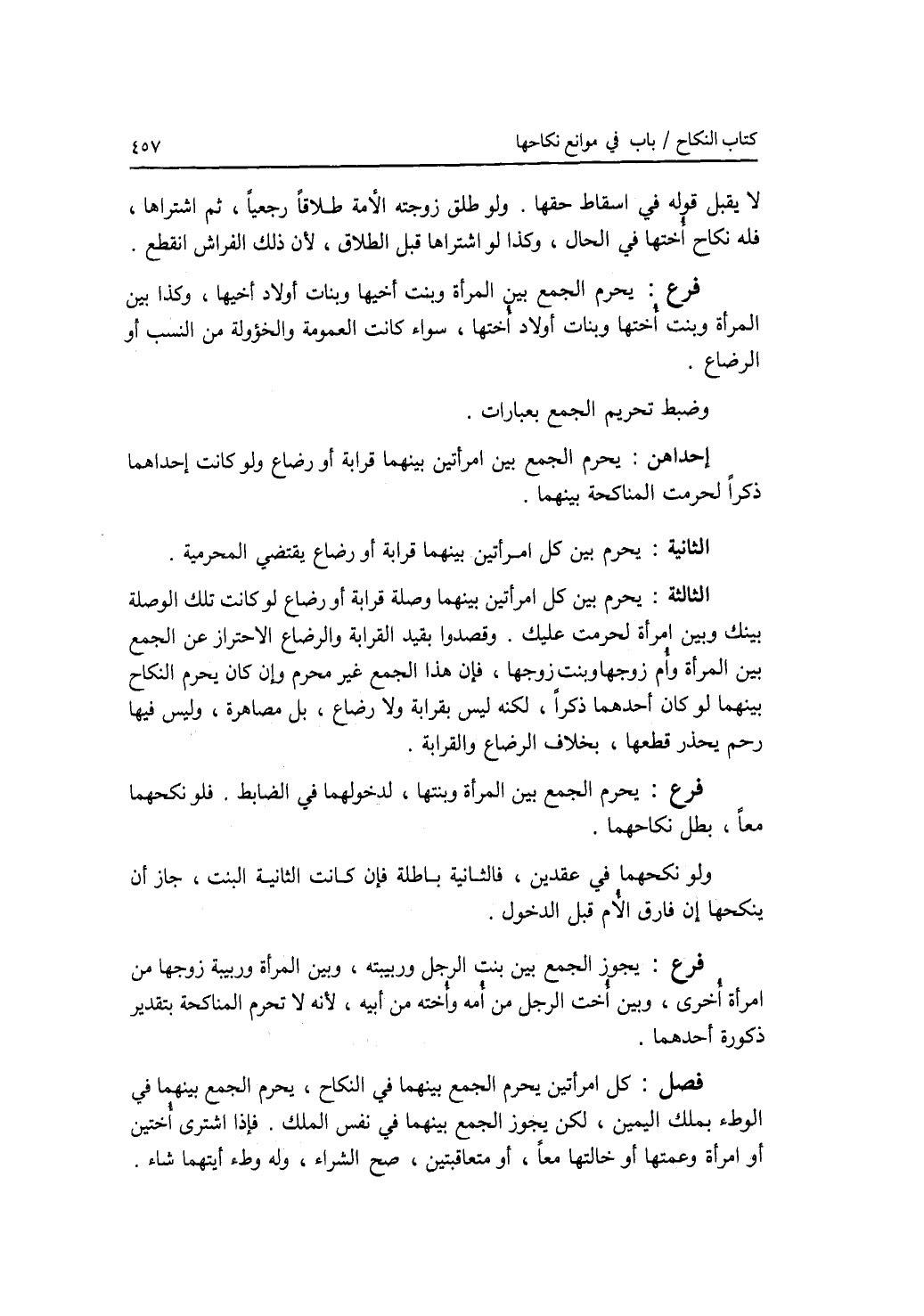 لا يقبل قوله في إسقاط حقها. ولو طلق زوجته الامة طلاقا رجعيا، ثم اشتراها، فله نكاح أختها في الحال، وكذا لو اشتراها قبل الطلاق، لان ذلك الفراش انقطع. فرع يحرم الجمع بين المرأة وبنت أخيها وبنات أولاد أخيها، وكذا بين المرأة وبنت أختها وبنات أولاد أختها، سواء كانت العمومة والخؤولة من النسب أو الرضاع. وضبط تحريم الجمع بعبارات. إحداهن: يحرم الجمع بين كل إمرأتين بينهما قرابة أو رضاع ولو كانت إحداهما ذكرا لحرمت المناكحة بينهما. الثانية: يحرم بين كل إمرأتين بينهما قرابة أو رضاع يقتضي المحرمية. الثالثة: يحرم بين كل إمرأتين بينهما وصلة قرابة أو رضاع لو كانت تلك الوصلة بينك وبين إمرأة لحرمت عليك. وقصدوا بقيد القرابة والرضاع الاحتراز عن الجمع بين المرأة وأم زوجها وبنت زوجها، فإن هذا الجمع غير محرم وإن كان يحرم النكاح بينهما لو كان أحدهما ذكرا، لكنه ليس بقرابة ولا رضاع، بل مصاهرة، وليس فيها رحم يحذر قطعها، بخلاف الرضاع والقرابة. فرع يحرم الجمع بين المرأة وبنتها، لدخولهما في الضابط. فلو نكحهما معا، بطل نكاحهما. ولو نكحهما في عقدين، فالثانية باطلة. فإن كانت الثانية البنت، جاز أن ينكحها إن فارق الام قبل الدخول. فرع يجوز الجمع بين بنت الرجل وربيبته، وبين المرأة وربيبة زوجها من إمرأة أخرى، وبين أخت الرجل من أمه وأخته من أبيه، لانه لا تحرم المناكحة بتقدير ذكورة أحدهما. فصل كل امرأتين يحرم الجمع بينهما في النكاح، يحرم الجمع بينهما في الوطئ بملك اليمين، لكن يجوز الجمع بينهما في نفس الملك. فإذا اشترى أختين أو امرأة وعمتها أو خالتها معا، أو متعاقبتين، صح الشراء، وله وطئ أيتهما شاء.