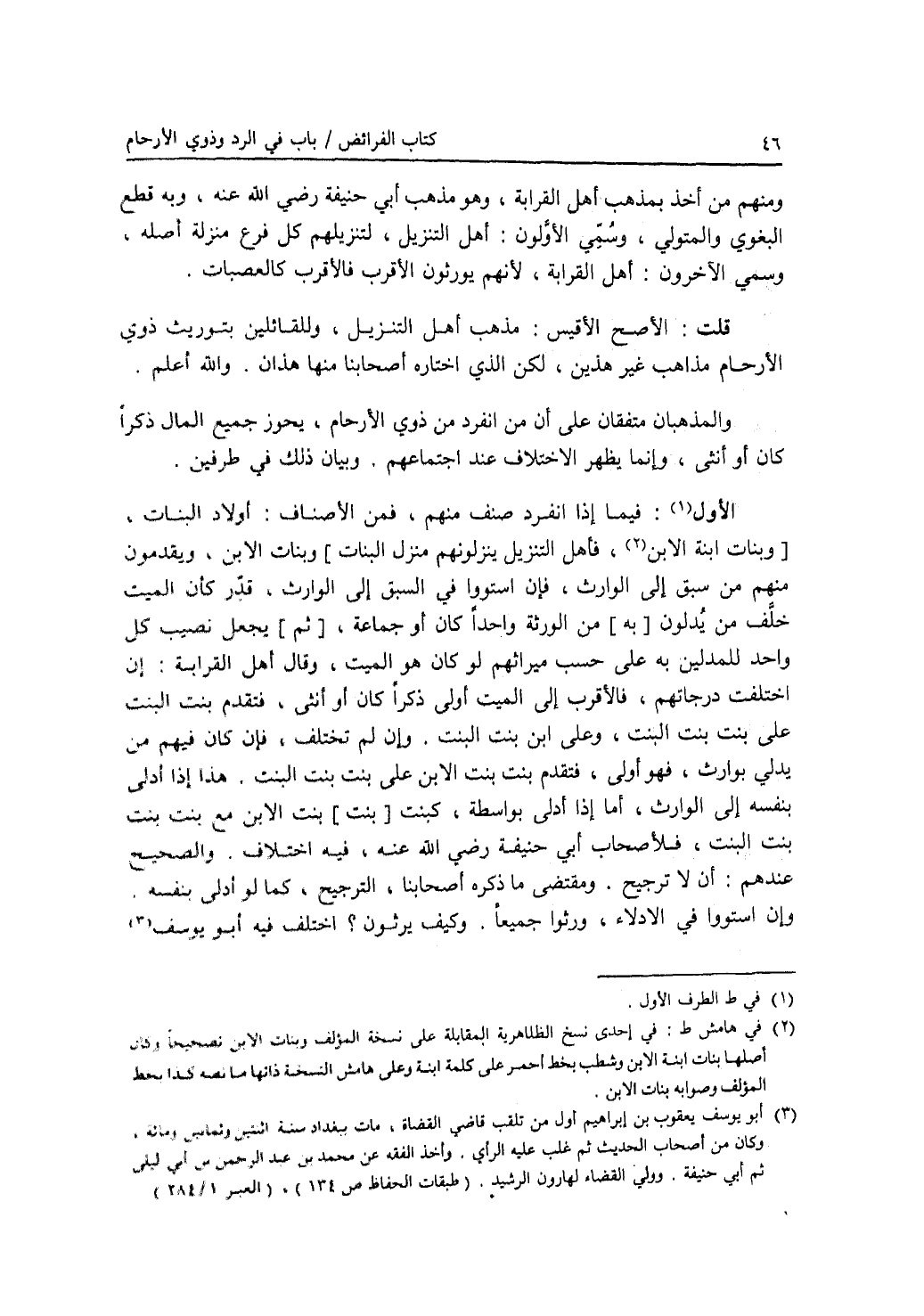 ومنهم من أخذ بمذهب أهل القرابة، وهو مذهب أبي حنيفة رضي الله عنه، وبه قطع البغوي والمتولي، وسمي الاولون: أهل التنزيل، لتنزيلهم كل فرع منزلة أصله، وسمي الآخرون: أهل القرابة، لانهم يورثون الاقرب فالاقرب كالعصبات. قلت: الاصح الاقيس: مذهب أهل التنزيل. وللقائلين بتوريث ذوي الارحام، مذاهب غير هذين، لكن الذي اختاره أصحابنا منها هذان. والله أعلم. والمذهبان متفقان على أن من انفرد من ذوي الارحام، يحوز جميع المال ذكرا كان أو أنثى، وإنما يظهر الاختلاف عند اجتماعهم. وبيان ذلك في طرفين. الطرف الاول: فيما إذا انفرد صنف منهم، فمن الاصناف: أولاد البنات، وبنات ابنة الابن، فأهل التنزيل ينزلونهم منزلة البنات وبنات الابن، ويقدمون منهم من سبق إلى الوارث، فان استووا في السبق إلى الوارث، قدر كأن الميت خلف من يدلون به من الورثة واحدا كان أو جماعة، ثم يجعل نصيب كل واحد للمدلين به على حسب ميراثهم لو كان هو الميت، وقال أهل القرابة: إن اختلفت درجاتهم، فالاقرب إلى الميت أولى ذكرا كان أو أنثى، فتقدم بنت البنت على بنت بنت البنت، وعلى ابن بنت البنت. وإن لم تختلف، فان كان فيهم من يدلي بوارث، فهو أولى، فتقدم بنت بنت الابن على بنت بنت البنت. هذا إذا أدلى بنفسه إلى الوارث، أما إذا أدلى بواسطة، كبنت بنت بنت الابن مع بنت بنت بنت البنت، فلاصحاب أبي حنيفة رضي الله عنه، فيه اختلاف. والصحيح عندهم: أن لا ترجيح. ومقتضى ما ذكره أصحابنا، الترجيح، كما لو أدلى بنفسه. وإن استووا في الادلاء، ورثوا جميعا. وكيف يرثون ؟ اختلف فيه أبو يوسف ومحمد، فقال أبو يوسف: