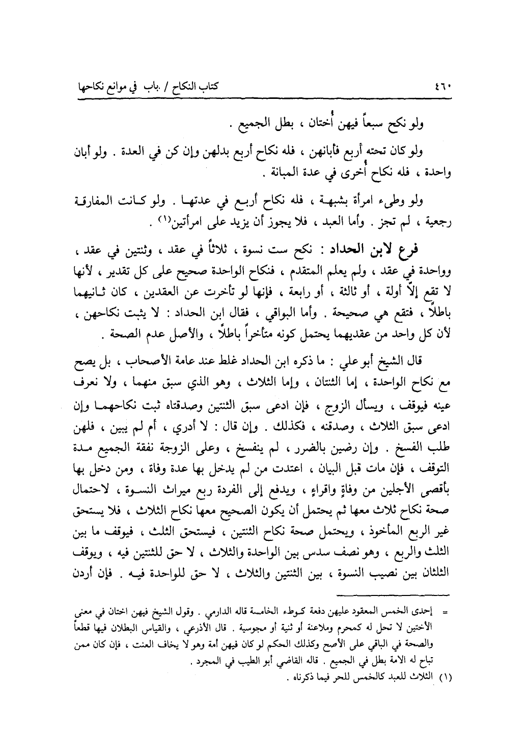 ولو نكح سبعا فيهن أختان، بطل الجميع. ولو كان تحته أربع فأبانهن، فله نكاح أربع بدلهن وإن كن في العدة. ولو أبان واحدة، فله نكاح أخرى في عدة المبانة. ولو وطئ إمرأة بشبهة، فله نكاح أربع في عدتها. ولو كانت المفارقة رجعية، لم تجز. وأما العبد، فلا يجوز أن يزيد على إمرأتين. فرع لابن الحداد نكح ست نسوة، ثلاثا في عقد، وثنتين في عقد، وواحدة في عقد، ولم يعلم المتقدم، فنكاح الواحدة صحيح على كل تقدير، لانها لا تقع إلا أولة، أو ثالثة، أو رابعة، فإنها لو تأخرت عن العقدين، كان ثانيهما باطلا، فتقع هي صحيحة. وأما البواقي، فقال ابن الحداد: لا يثبت نكاحهن، لان كل واحد من عقديهما يحتمل كونه متأخرا باطلا، والاصل عدم الصحة. قال الشيخ أبو علي: ما ذكره ابن الحداد غلط عند عامة الاصحاب، بل يصح مع نكاح الواحدة، إما الثنتان، وإما الثلاث، وهو الذي سبق منهما، ولا نعرف عينه فيوقف، ويسأل الزوج، فإن ادعى سبق الثنتين وصدقتاه، ثبت نكاحهما. وإن ادعى سبق الثلاث، وصدقنه، فكذلك. وإن قال: لا أدري، أو لم يبين، فلهن طلب الفسخ. وإن رضين بالضرر، لم ينفسخ، وعلى الزوج نفقة الجميع مدة التوقف، فإن مات قبل البيان، اعتدت من لم يدخل بها عدة وفاة، ومن دخل بها بأقصى الاجلين من وفاة وأقراء، ويدفع إلى الفردة ربع ميراث النسوة، لاحتمال صحة نكاح ثلاث معها، ثم يحتمل أن يكون الصحيح معها نكاح الثلاث، فلا يستحق غير الربع المأخوذ، ويحتمل صحة نكاح الثنتين، فيستحق الثلث، فيوقف ما بين الثلث والربع، وهو نصف سدس بين الواحدة والثلاث، لا حق للثنتين فيه، ويوقف الثلثان بين نصيب النسوة، بين الثنتين والثلاث، لا حق للواحدة فيه. فإن أردن