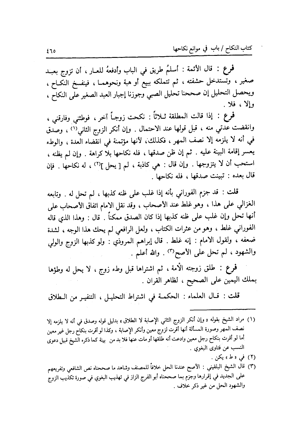 فرع قال الائمة: أسلم طريق في الباب، وأدفعه للعار، أن تزوج بعبد صغير، وتستدخل حشفته، ثم تتملكه ببيع أو هبة ونحوهما، فينفسخ النكاح، ويحصل التحليل إن صححنا تحليل الصبي وجوزنا إجبار العبد الصغير على النكاح، وإلا، فلا. فرع إذا قالت المطلقة ثلاثا: نكحت زوجا آخر، فوطئني وفارقني، وانقضت عدتي منه، قبل قولها عند الاحتمال. وإن أنكر الزوج الثاني، وصدق في أنه لا يلزمه إلا نصف المهر، فكذلك، لانها مؤتمنة في انقضاء العدة، والوطئ يعسر إقامة البينة عيله. ثم إن ظن صدقها، فله نكاحها بلا كراهة. وإن لم يظنه، استحب أن لا يتزوجها. وإن قال: هي كاذبة، لم يكن له نكاحها. فإن قال بعده: تبينت صدقها، فله نكاحها. قلت: قد حزم الفوراني بأنه إذا غلب على ظنه كذبها، لم تحل له. وتابعه الغزالي على هذا، وهو غلط عند الاصحاب، وقد نقل الامام إتفاق الاصحاب على أنها تحل وإن غلب على ظنه كذبها إذا كان الصدق ممكنا. قال: وهذا الذي قاله الفوراني غلط، وهو من عثرات الكتاب، ولعل الرافعي لم يحك هذا الوجه، لشدة ضعفه، ولقول الامام: إنه غلط. قال إبرهيم المروذي: ولو كذبها الزوج والولي والشهود، لم تحل على الاصح. والله أعلم. فرع طلق زوجته الامة، ثم اشتراها قبل وطئ زوج، لا يحل له وطؤها بملك اليمين على الصحيح، لظاهر القران. قلت: قال العلماء: الحكمة في اشتراط التحليل، التنفير من الطلاق