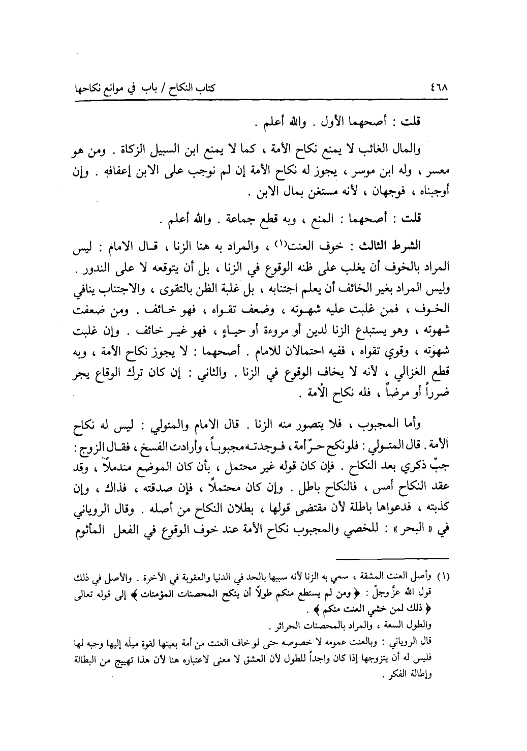 قلت: أصحهما الاول. والله أعلم. والمال الغائب لا يمنع نكاح الامة، كما لا يمنع ابن السبيل الزكاة. ومن هو معسر، وله ابن موسر، يجوز له نكاح الامة إن لم نوجب على الابن إعفافه. وإن أوجبناه، فوجهان، لانه مستغن بمال الابن. قلت: أصحهما: المنع، وبه قطع جماعة. والله أعلم. الشرط الثالث: خوف العنت، والمراد به هنا الزنا، قال الامام: ليس المراد بالخوف أن يغلب على ظنه الوقوع في الزنا، بل أن يتوقعه لا على الندور. وليس المراد بغير الخائف أن يعلم اجتنابه، بل غلبة الظن بالتقوى، والاجتناب ينافي الخوف، فمن غلبت عليه شهوته، وضعف تقواه، فهو خائف. ومن ضعفت شهوته، وهو يستبدع الزنا لدين أو مروءة أو حياء، فهو غير خائف. وإن غلبت شهوته، وقوي تقواه، ففيه إحتمالان للامام. أصحهما: لا يجوز نكاح الامة، وبه قطع الغزالي، لانه لا يخاف الوقوع في الزنا. والثاني: إن كان ترك الوقاع يجر ضررا أو مرضا، فله نكاح الامة. وأما المجبوب، فلا يتصور منه الزنا. قال الامام والمتولي: ليس له نكاح الامة. قال المتولي: فلو نكح حر أمة، فوجدته مجبوبا، وأرادت الفسخ، فقال الزوج: جب ذكري بعد النكاح. فإن كان قوله غير محتمل، بأن كان الموضع مندملا، وقد عقد النكاح أمس، فالنكاح باطل. وإن كان محتملا، فإن صدقنه، فذاك، وإن كذبته، فدعواها باطلة لان مقتضى قولها، بطلان النكاح من أصله. وقال الروياني في البحر: للخصي والمجبوب نكاح الامة عند خوف الوقوع في الفعل المأثوم