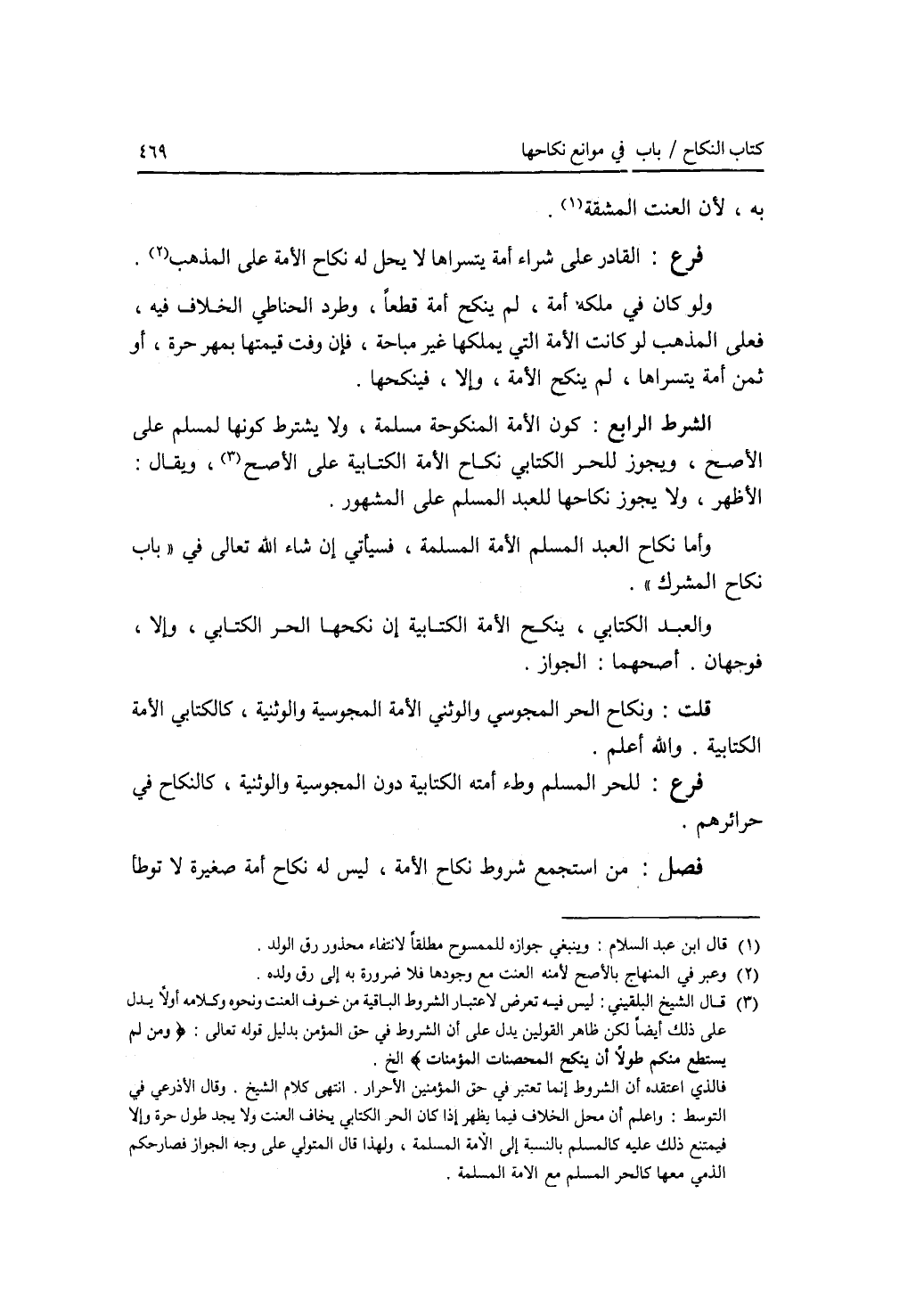 به، لان العنت المشقة. فرع القادر على شراء أمة يتسراها، لا يحل له نكاح أمة على المذهب. ولو كان في ملكه أمة، لم ينكح أمة قطعا، وطرد الحناطي الخلاف فيه، فعلى المذهب لو كانت الامة التي يملكها غير مباحة، فإن وفت قيمتها بمهر حرة، أو ثمن أمة يتسراها، لم ينكح الامة، وإلا، فينكحها. الشرط الرابع: كون الامة المنكوحة مسلمة، ولا يشترط كونها لمسلم على الاصح، ويجوز للحر الكتابي نكاح الامة الكتابية على الاصح، ويقال: الاظهر، ولا يجوز نكاحها للعبد المسلم على المشهور. وأما نكاح العبد المسلم الامة المسلمة، فسيأتي إن شاء الله تعالى في باب (نكاح) المشرك. والعبد الكتابي، ينكح الامة الكتابية إن نكحها الحر الكتابي، وإلا، فوجهان. أصحهما: الجواز. قلت: ونكاح الحر المجوسي والوثني الامة المجوسية والوثنية، كالكتابي الامة الكتابية. والله أعلم. فرع للحر المسلم وطئ أمته الكتابية دون المجوسية والوثنية، كالنكاح في حرائرهم. فصل من استجمع شروط نكاح الامة، ليس له نكاح أمة صغيرة لا توطأ