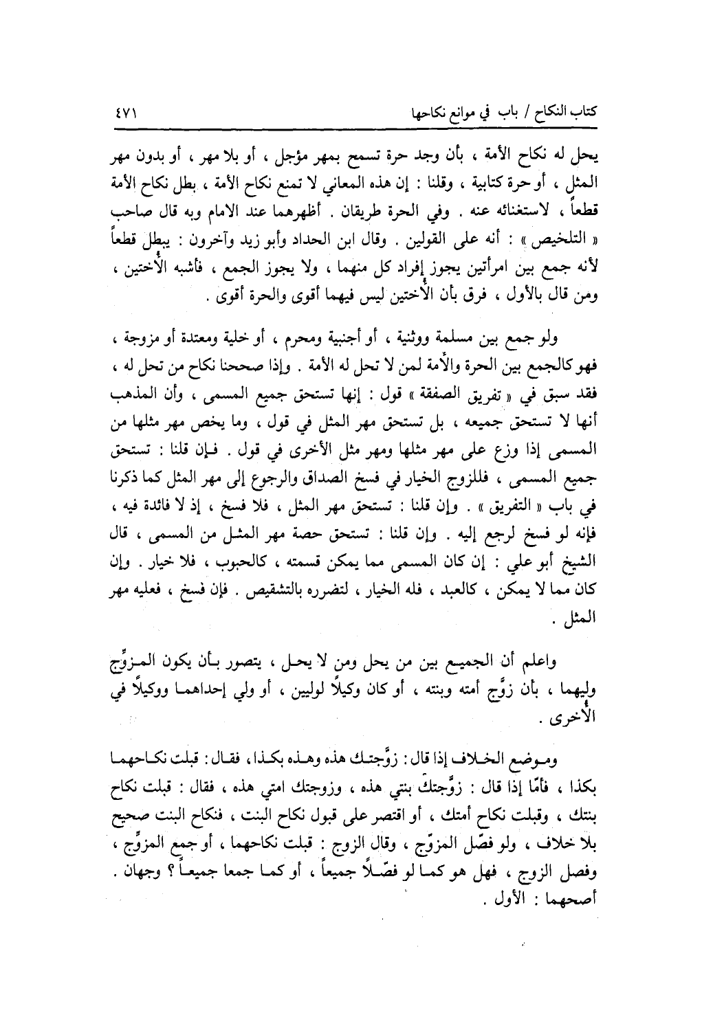 يحل له نكاح الامة، بأن وجد حرة تسمح بمهر مؤجل، أو بلا مهر، أو بدون مهر المثل، أو حرة كتابية، وقلنا: إن هذه المعاني لا تمنع نكاح الامة، بطل نكاح الامة قطعا، لاستغنائه عنه. وفي الحرة طريقان. أظهرهما عند الامام وبه قال صاحب التلخيص: أنه على القولين. وقال ابن الحداد وأبو زيد وآخرون: يبطل قطعا، لانه جمع بين إمرأتين يجوز إفراد كل منهما، ولا يجوز الجمع، فأشبه الاختين، ومن قال بالاول، فرق بأن الاختين ليس فيهما أقوى (والحرة أقوى). ولو جمع بين مسلمة ووثنية، أو أجنبية ومحرم، أو خلية ومعتدة أو مزوجة، فهو كالجمع بين الحرة والامة لمن لا تحل له الامة. وإذا صححنا نكاح من تحل (له)، فقد سبق في تفريق الصفقة قول: أنها تستحق جميع المسمى، وأن المذهب أنها لا تستحق جميعه، بل تستحق مهر المثل في قول، وما يخص مهر مثلها من المسمى إذا وزع على مهر مثلها ومهر مثل الا خرى في قول. فإن قلنا: تستحق جميع المسمى، فللزوج الخيار في فسخ الصداق والرجوع إلى مهر المثل كما ذكرنا في باب التفريق. وإن قلنا: تستحق مهر المثل، فلا فسخ، إذ لا فائدة (فيه)، فإنه لو فسخ لرجع إليه. وإن قلنا: تستحق حصة مهر المثل من المسمى، قال الشيخ أبو علي: إن كان المسمى مما يمكن قسمته، كالحبوب، فلا خيار. وإن كان مما لا يمكن، كالعبد، فله الخيار، لتضرره بالتشقيص. فإن فسخ، فعليه مهر المثل. واعلم أن الجميع بين من يحل ومن لا يحل، يتصور بأن يكون المزوج وليهما، بأن زوج أمته وبنته، أو كان وكيلا لوليين، أو ولي إحداهما ووكيلا في الاخرى. وموضع الخلاف إذا قال: زوجتك هذه وهذه بكذا، فقال: قبلت نكاحهما بكذا. فأما إذا قال: زوجتك بنتي هذه، وزوجتك أمتي هذه، فقال: قبلت نكاح بنتك، وقبلت نكاح أمتك، أو اقتصر على قبول نكاح البنت، فنكاح البنت صحيح بلا خلاف، ولو فصل المزوج، وقال الزوج: قبلت نكاحهما، أو جمع المزوج، وفصل الزوج، فهل هو كما لو فصلا جميعا، أو كما جمعا جميعا ؟ وجهان. أصحهما: الاول.
