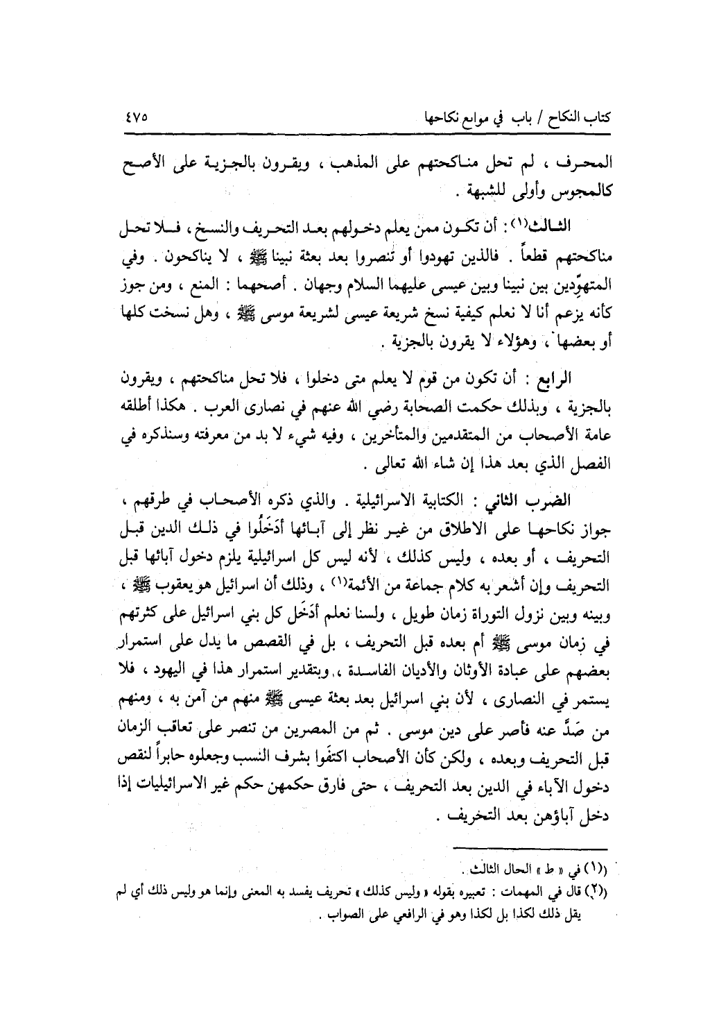 المحرف، لم تحل مناكحتهم على المذهب، ويقرون بالجزية على الاصح كالمجوس وأولى للشبهة. (الحال) الثالث: أن تكون ممن يعلم دخولهم بعد التحريف والنسخ، فلا تحل مناكحتهم قطعا. فالذين تهودوا أو تنصروا بعد بعثة نبينا - صلى الله عليه وسلم -، لا يناكحون. وفي المتهودين بين نبينا وبين عيسى عليهما السلام وجهان. أصحهما: المنع، ومن جوز كأنه يزعم أنا لا نعلم كيفية نسخ شريعة عيسى لشريعة موسى صلى الله عليهما وسلم، وهل نسخت كلها أو بعضها، وهؤلاء لا يقرون بالجزية. الرابع: أن تكون من قوم لا يعلم متى دخلوا، فلا تحل مناكحتهم، ويقرون بالجزية، وبذلك حكمت الصحابة رضي الله أنهم في نصارى العرب. هكذا أطلقه عامة الاصحاب من المتقدمين والمتأخرين، وفيه شئ لا بد من معرفته وسنذكره في الفصل الذي بعد هذا إن شاء الله تعالى. الضرب الثاني: الكتابية الاسرائيلية. والذي ذكره الاصحاب في طرقهم، جواز نكاحها على الاطلاق من غير نظر إلى آبائها أدخلوا في ذلك الدين قبل التحريف، أم بعده، وليس كذلك لان ليس كل إسرائيلية يلزم دخول آبائها قبل التحريف وإن أشعر به كلام جماعة من الائمة، وذلك أن إسرائيل هو يعقوب - صلى الله عليه وسلم -، وبينه وبين نزول التوراة زمان طويل، ولسنا نعلم أدخل كل بني إسرائيل على كثرتهم في زمان موسى - صلى الله عليه وسلم - أم بعده قبل التحريف، بل في القصص ما يدل على استمرار بعضهم على عبادة الاوثان والاديان الفاسدة، وبتقدير إستمرار هذا في اليهود، فلا يستمر في النصارى، لان بني إسرائيل بعد بعثة عيسى - صلى الله عليه وسلم - منهم من آمن به، ومنهم من صد عنه فأصر على دين موسى. ثم من المصرين من تنصر على تعاقب الزمان قبل التحريف وبعده، ولكن كأن الاصحاب اكتفوا بشرف النسب وجعلوه حابرا لنقص دخول الآباء في الدين بعد التحريف، حتى فارق حكمهن حكم غير الاسرائيليات إذا دخل آباؤهن بعد التحريف.