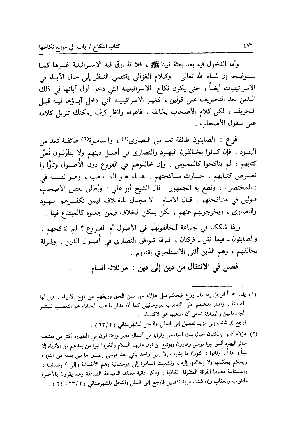 وأما الدخول فيه بعد بعثة نبينا - صلى الله عليه وسلم -، فلا تفارق فيه الاسرائيلية غيرها كما سنوضحه إن شاء الله تعالى. وكلام الغزالي يقتضي النظر إلى حال الآباء في الاسرائيليات أيضا، حتى يكون نكاح الاسرائيلية التي دخل أول آبائها في ذلك الدين بعد التحريف على قولين، كغير الاسرائيلية التي دخل آباؤها فيه قبل التحريف، لكن كلام الاصحاب يخالفه، فاعرفه وانظر كيف يمكنك تنزيل كلامه على منقول الاصحاب. فرع الصابئون طائفة تعد من النصارى، والسامرة طائفة تعد من اليهود. فإن كانوا يخالفون اليهود والنصارى في أصل دينهم ولا يتأولون نص كتابهم، لم يناكحوا كالمجوس. وإن خالفوهم في الفروع دون الاصول وتأولوا نصوص كتابهم، جازت مناكحتهم. هذا هو المذهب، وهو نصه في المختصر، وقطع به الجمهور. قال الشيخ أبو علي: وأطلق بعض الاصحاب قولين في مناكحتهم. قال الامام: لا مجال للخلاف فيمن تكفرهم اليهود والنصارى، ويخرجونهم عنهم، لكن يمكن الخلاف فيمن جعلوه كالمبتدع فينا. وإذا شككنا في جماعة أيخالفونهم في الاصول أم الفروع ؟ لم نناكحهم. والصابئون - فيما نقل - فرقتان، فرقة توافق النصارى في أصول الدين، وفرقة تخالفهم، وهم الذين أفتى الاصطخري بقتلهم.