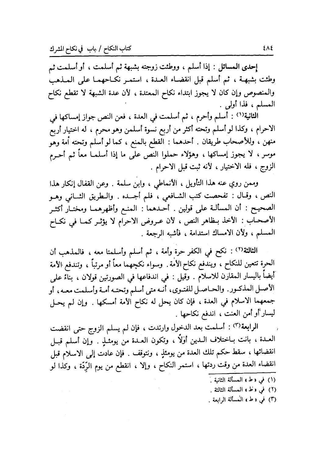 إحدى المسائل: إذا أسلم، ووطئت زوجته بشبهة ثم أسلمت، أو أسلمت ثم وطئت بشبهة، ثم أسلم قبل انقضاء العدة، استمر نكاحهما على المذهب والمنصوص وإن كان لا يجوز ابتداء نكاح المعتدة، لان عدة الشبهة لا تقطع نكاح المسلم، فذا أولى. المسألة الثانية: أسلم وأحرم، ثم أسلمت في العدة، فعن النص جواز إمساكها في الاحرام، وكذا لو أسلم وتحته أكثر من أربع نسوة ثم أسلمن وهو محرم، له اختيار (أربع) منهن، وللاصحاب طريقان. أحدهما: القطع بالمنع، كما لو أسلم وتحته أمة وهو موسر، لا يجوز إمساكها، وهؤلاء حملوا النص على ما إذا أسلما معا ثم أحرم الزوج، فله الاختيار، لانه ثبت قبل الاحرام. وممن روي عنه هذا التأويل، الانماطي، وابن سلمة. وعن القفال إنكار هذا النص، وقال: تفحصت كتب الشافعي، فلم أجده. والطريق الثاني وهو الصحيح: أن المسألة على قولين. أحدهما: المنع. وأظهرهما ومختار أكثر الاصحاب: الاخذ بظاهر النص، لان عروض الاحرام لا يؤثر كما في نكاح المسلم، ولان الامساك استدامة، فأشبه الرجعة. المسألة الثالثة: نكح في الكفر حرة وأمة، ثم أسلم وأسلمتا معه، فالمذهب أن الحرة تتعين للنكاح، ويندفع نكاح الامة. وسواء نكحهما معا أو مرتبا، وتندفع الامة أيضا باليسار المقارن للاسلام. وقيل: في اندفاعها في الصورتين قولان، بناء على الاصل المذكور. والحاصل للفتوى، أنه متى أسلم وتحته أمة وأسلمت معه، أو جمعهما الاسلام في العدة، فإن كان يحل له نكاح الامة أمسكها، وإن لم يحل ليسار أو أمن العنت، اندفع نكاحها. المسألة الرابعة: أسلمت بعد الدخول وارتدت، فإن لم يسلم الزوج حتى انقضت العدة، بانت باختلاف الدين أولا، وتكون العدة من يومئذ. وإن أسلم قبل انقضائها، سقط حكم تلك العدة من يومئذ، ونتوقف. فإن عادت إلى الاسلام قبل انقضاء العدة من وقت ردتها، استمر النكاح، وإلا، انقطع من يوم الردة، وكذا لو