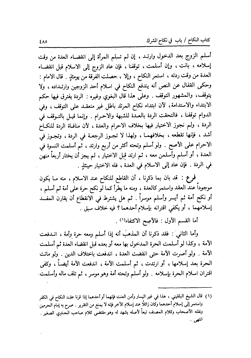 أسلم الزوج بعد الدخول وارتد، إن لم تسلم المرأة إلى انقضاء العدة من وقت إسلامه، بانت، وإن أسلمت، توقفنا، فإن عاد الزوج إلى الاسلام قبل انقضاء العدة من وقت ردته، استمر النكاح، وإلا، حصلت الفرقة من يومئذ. قال الامام: وحكى القفال عن النص أنه يندفع النكاح في إسلام أحد الزوجين وارتداده، ولا يتوقف، والمشهور التوقف. وعلى هذا قال البغوي وغيره: الردة يفترق فيها حكم الابتداء والاستدامة، لان ابتداء نكاح المرتد باطل غير منعقد على التوقف، وفي الدوام توقفنا، فالتحقت الردة بالعدة للشبهة والاحرام. وإنما قيل بالتوقف في الردة، ولم نجوز الاختيار فيها بخلاف الاحرام والعدة، لان منافاة الردة للنكاح أشد، فإنها تقطعه، بخلافهما، ولهذا لا تجوز الرجعة في الردة، وتجوز في الاحرام على الاصح. ولو أسلم وتحته أكثر من أربع، وارتد، ثم أسلمت النسوة في العدة، أو أسلم وأسلمن معه، ثم ارتد قبل الاختيار، لم يجز أن يختار أربعا منهن في الردة. فإن عاد إلى الاسلام في العدة، فله الاختيار حينئذ. فرع قد بان بما ذكرنا، أن القاطع للنكاح عند الاسلام، منه ما يكون موجودا عند العقد واستمر كالعدة، ومنه ما يطرأ كما لو نكح حرة على أمة ثم أسلم، أو نكح أمة ثم أيسر وأسلم موسرا. ثم هل يشترط في الانقطاع أن يقارن المفسد إسلامهما، أو يكفي اقترانه بإسلام أحدهما ؟ فيه خلاف سبق. أما القسم الاول: فالاصح الاكتفاء. وأما الثاني: فقد ذكرنا أن المذهب أنه إذا أسلم ومعه حرة وأمة، اندفعت الامة، وكذا لو أسلمت الحرة المدخول بها معه أو بعده قبل انقضاء العدة ثم أسلمت الامة. ولو أصرت الامة حتى انقضت العدة، اندفعت باختلاف الدين. ولو ماتت الحرة بعد إسلامها، أو ارتدت، ثم أسلمت الامة، اندفعت الامة أيضا، وكفى اقتران إسلام الحرة بإسلامه. ولو أسلم وتحته أمة وهو موسر، ثم تلف ماله وأسلمت