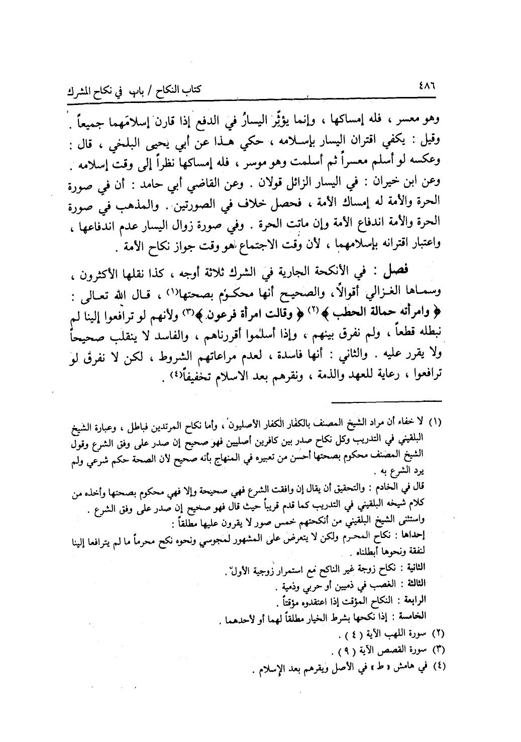 فصل في الأنكحة الجارية في الشرك ثلاثة أوجه، كذا نقلها الاكثرون، وسماها الغزالي أقوالا، والصحيح أنها محكوم بصحتها، قال الله تعالى: * (وامرأته حمالة الحطب) * * (وقالت امرأة فرعون) * ولانهم لو ترافعوا إلينا لم نبطله قطعا، ولم نفرق بينهم، وإذا أسلموا أقررناهم، والفاسد لا ينقلب صحيحا ولا يقرر عليه. والثاني: أنها فاسدة، لعدم مراعاتهم الشروط، لكن لا نفرق لو ترافعوا، رعاية للعهد والذمة، ونقرهم بعد الاسلام تخفيفا.
