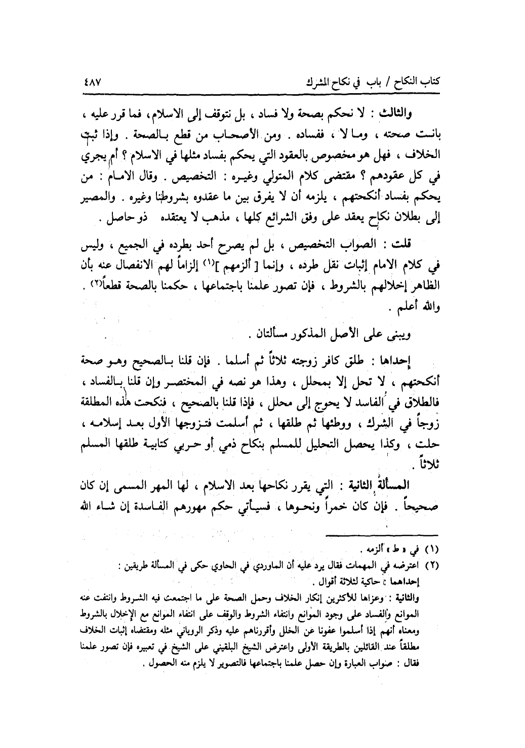 والثالث: لا نحكم بصحة ولا فساد، بل نتوقف إلى الاسلام، فما قرر عليه، بانت صحته، وما لا، ففساده. ومن الاصحاب من قطع بالصحة. وإذا ثبت الخلاف، فهل هو مخصوص بالعقود التي يحكم بفساد مثلها في الاسلام ؟ أم يجري في كل عقودهم ؟ مقتضى كلام المتولي وغيره: التخصيص. وقال الامام: من يحكم بفساد أنكحتهم، يلزمه أن لا يفرق بين ما عقدوه بشروطنا وغيره. والمصير إلى بطلان نكاح يعقد على وفق الشرائع كلها، مذهب لا يعتقده ذو حاصل. قلت: الصواب التخصيص، بل لم يصرح أحد بطرده في الجميع، وليس في كلام الامام إثبات نقل طرده، وانما ألزمه إلزاما لهم الانفصال عنه بأن الظاهر إخلالهم بالشروط، فإن تصور علمنا باجتماعها، حكمنا بالصحة قطعا. والله أعلم. ويبنى على الاصل المذكور مسألتان. إحداهما: طلق كافر زوجته ثلاثا ثم أسلما. فإن قلنا بالصحيح وهو صحة أنكحتهم، لا تحل إلا بمحلل، وهذا هو نصه في المختصر. وإن قلنا بالفساد، فالطلاق في الفاسد لا يحوج إلى محلل، فإذا قلنا بالصحيح، فنكحت هذه المطلقة زوجا في الشرك، ووطئها ثم طلقها، ثم أسلمت فتزوجها الاول بعد إسلامه، حلت، وكذا يحصل التحليل للمسلم بنكاح ذمي أو حربي كتابية طلقها المسلم ثلاثا. المسألة الثانية: التي يقرر نكاحها بعد الاسلام، لها المهر المسمى إن كان صحيحا. فإن كان خمرا ونحوها، فسيأتي حكم مهورهم الفاسدة إن شاء الله