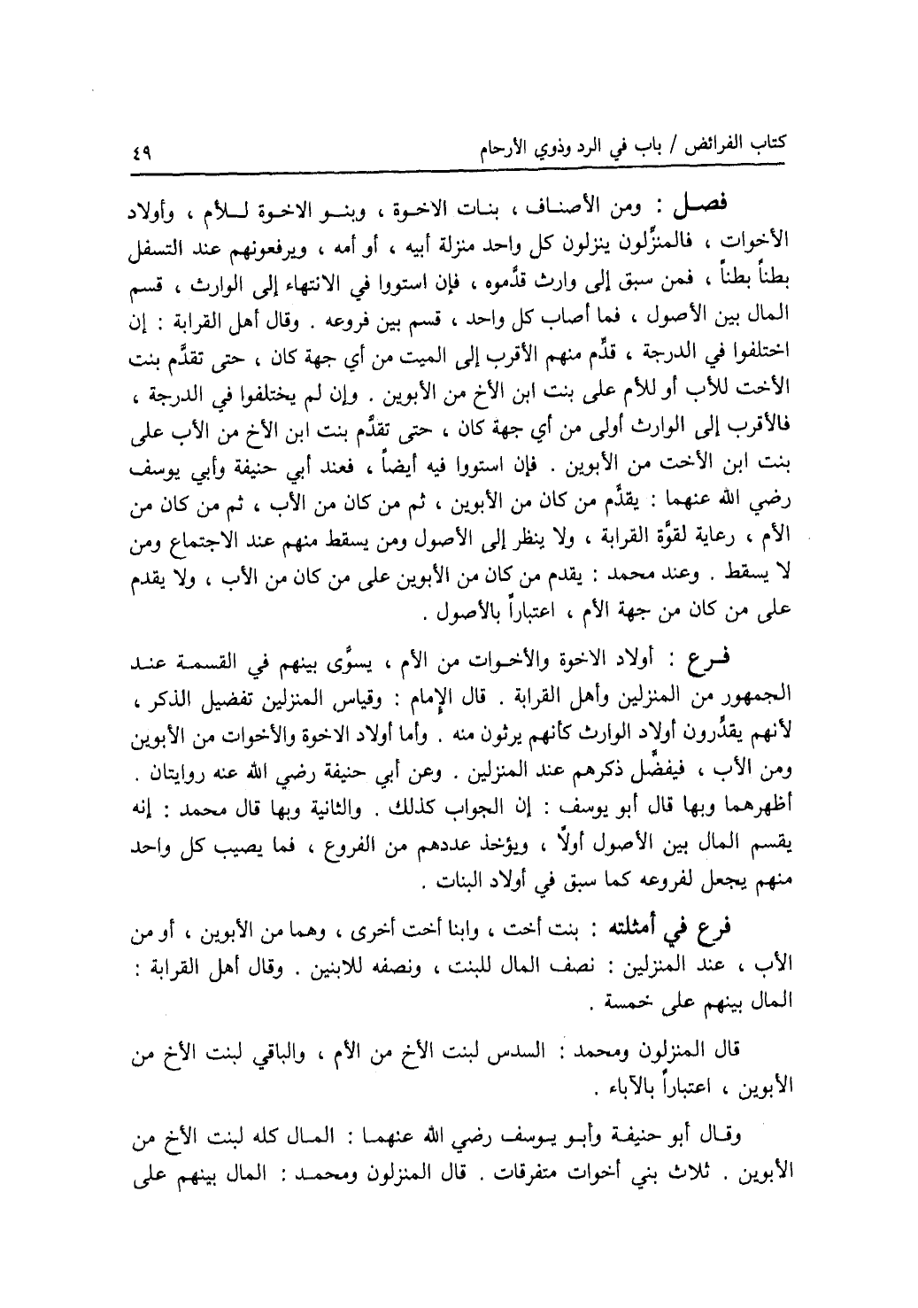 فصل ومن الاصناف، بنات الإخوة، وبنو الاخوة للأم، وأولاد الاخوات، فالمنزلون ينزلون كل واحد منزلة أبيه، أو أمه، ويرفعونهم عند التسفل بطنا بطنا، فمن سبق إلى وارث قدموه، فان استووا في الانتهاء إلى الوارث، قسم المال بين الاصول، فما أصاب كل واحد، قسم بين فروعه. وقال أهل القرابة: إن اختلفوا في الدرجة، قدم منهم الاقرب إلى الميت من أي جهة كان، حتى تقدم بنت الاخت للاب أو للام على بنت ابن الاخ من الابوين. وإن لم يختلفوا في الدرجة، فالاقرب إلى الوارث أولى من أي جهة كان، حتى تقدم بنت ابن الاخ من الاب على بنت ابن الاخت من الابوين. فان استووا فيه أيضا، فعند أبي حنيفة وأبي يوسف رضي الله عنهما: يقدم من كان من الابوين، ثم من كان من الاب، ثم من كان من الام، رعاية لقوة القرابة، ولا ينظر إلى الاصول ومن يسقط منهم عند الاجتماع ومن لا يسقط. وعند محمد: يقدم من كان من الابوين على من كان من الاب، ولا يقدم على من كان من جهة الام، اعتبارا بالاصول. فرع أولاد الاخوة والاخوات من الام، يسوى بينهم في القسمة عند الجمهور من المنزلين وأهل القرابة. قال الامام: وقياس المنزلين تفضيل الذكر، لانهم يقدرون أولاد الوارث كأنهم يرثون منه. وأما أولاد الاخوة والاخوات من الابوين ومن الاب، فيفضل ذكرهم عند المنزلين. وعن أبي حنيفة رضي الله عنه روايتان. أظهرهما وبها قال أبو يوسف: أن الجواب كذلك. والثانية وبها قال محمد: إنه يقسم المال بين الاصول أولا، ويؤخذ عددهم من الفروع، فما يصيب كل واحد منهم يجعل لفروعه كما سبق في أولاد البنات. فرع في أمثلته بنت أخت، وابنا أخت أخرى، وهما من الابوين، أو من الاب، عند المنزلين: نصف المال للبنت، ونصفه للابنين. وقال أهل القرابة: المال بينهم على خمسة. ثلاث بنات إخوة متفرقين. قال المنزلون ومحمد: السدس لبنت الاخ من الام، والباقي لبنت الاخ من الابوين، اعتبارا بالآباء. وقال أبو حنيفة وأبو يوسف رضي الله عنهما: المال كله لبنت الاخ من الابوين. ثلاث بني أخوات متفرقات. قال المنزلون ومحمد: المال بينهم على