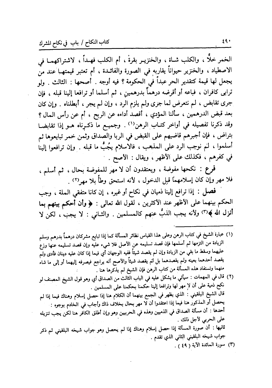 الخمر خلا، والكلب شاة، والخنزير بقرة، أم الكلب فهدا، لاشتراكهما في الاصطياد، والخنزير حيوانا يقاربه في الصورة والفائدة، أم تعتبر قيمتها عند من يجعل لها قيمة كتقدير الحر عبدا في الحكومة ؟ فيه أوجه. أصحها: الثالث. ولو ترابى كافران، فباعه أو أقرضه درهما بدرهمين، ثم أسلما أو ترافعا إلينا قبله، فإن جرى تقابض، لم نتعرض لما جرى ولم يلزم الرد، وإن لم يجر، أبطلناه. وإن كان بعد قبض الدرهمين، سألنا المؤدي، أقصد أداءه عن الربح، أم عن رأس المال ؟ وقد ذكرنا تفصيله في أواخر كتاب الرهن. وجميع ما ذكرناه هو إذا تقابضا بتراض، فإن أجبرهم قاضيهم على القبض في الربا والصداق وثمن خمر تبايعوها ثم أسلموا، لم نوجب الرد على المذهب، فالاسلام يجب ما قبله. وإن ترافعوا إلينا في كفرهم، فكذلك على الاظهر، ويقال: الاصح. فرع نكحها مفوضة، ويعتقدون أن لا مهر للمفوضة بحال، ثم أسلم، فلا مهر وإن كان إسلامهما قبل الدخول، لانه استحق وطئا بلا مهر.