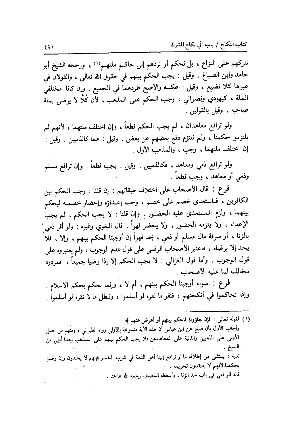 نتركهم على النزاع، بل نحكم أو نردهم إلى حاكم ملتهم، ورجحه الشيخ أبو حامد وابن الصباغ. وقيل: يجب الحكم بينهم في حقوق الله تعالى، والقولان في غيرها لئلا تضيع، وقيل: عكسه، والاصح طردهما في الجميع. وإن كانا مختلفي الملة، كيهودي ونصراني، وجب الحكم على المذهب، لان كلا لا يرضى بملة صاحبه. وقيل بالقولين. ولو ترافع معاهدان، لم يجب الحكم قطعا، وإن اختلف ملتهما، لانهم لم يلتزموا حكمنا، ولم نلتزم دفع بعضهم عن بعض. وقيل: هما كالذميين. وقيل: إن اختلف ملتهما، وجب، والمذهب الاول. ولو ترافع ذمي ومعاهد، فكالذميين. وقيل: يجب قطعا. وإن ترافع مسلم وذمي أو معاهد، وجب قطعا. فرع قال الاصحاب على اختلاف طبقاتهم: إن قلنا: وجب الحكم بين الكافرين، فاستعدى خصم على خصم، وجب إعداؤه وإحضار خصمه ليحكم بينهما، ولزم المستعدى عليه الحضور. وإن قلنا: لا يجب الحكم، لم يجب الاعداء، ولا يلزمه الحضور، ولا يحضر قهرا. قال البغوي وغيره: ولو أقر ذمي بالزنا، أو سرقة مال مسلم أو ذمي، حد قهرا إن أوجبنا الحكم بينهم، وإلا، فلا يحد إلا برضاه، فاعتبر الاصحاب الرضى على قول عدم الوجوب، ولم يعتبروه على قول الوجوب. وأما قول الغزالي: لا يجب الحكم إلا إذا رضيا جميعا، فمردود مخالف لما عليه الاصحاب. فرع سواء أوجبنا الحكم بينهم، أم لا، إنما نحكم بحكم الاسلام. وإذا تحاكموا في أنكحتهم، فنقر ما نقره لو أسلموا، ونبطل ما لا نقره لو أسلموا.