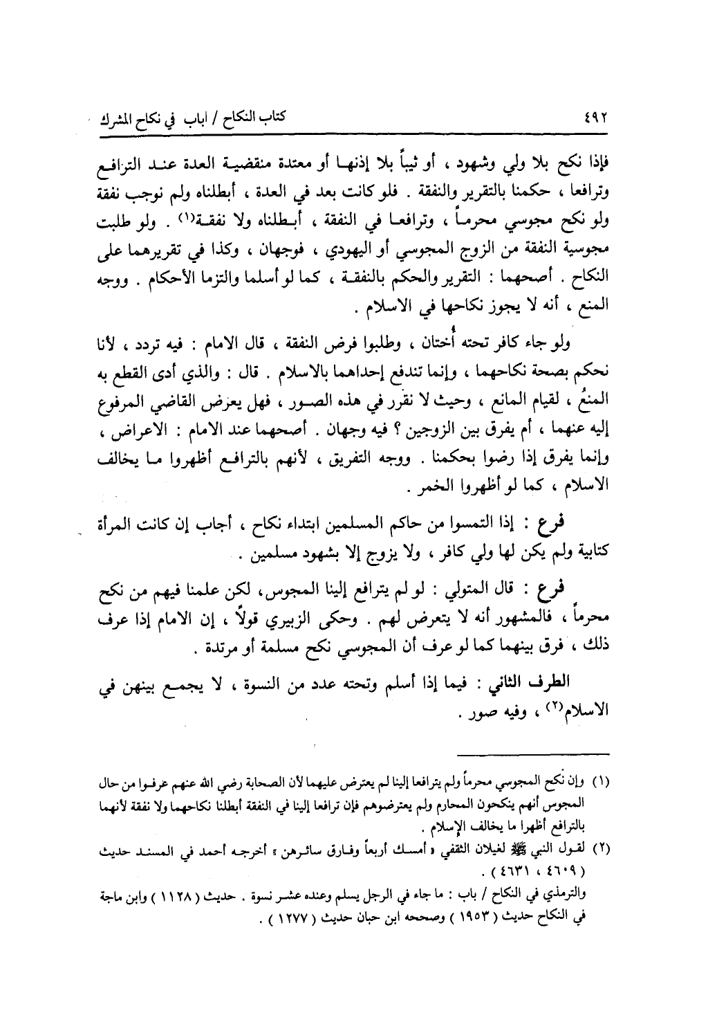 فإذا نكح بلا ولي وشهود، أو ثيبا بلا إذنها أو معتدة منقضية العدة عند الترافع وترافعا، حكمنا بالتقرير والنفقة. فلو كانت بعد في العدة، أبطلناه ولم نوجب نفقة. ولو نكح مجوسي محرما، وترافعا في النفقة، أبطلناه ولا نفقة. ولو طلبت مجوسية النفقة من الزوج المجوسي أو اليهودي، فوجهان، وكذا في تقريرهما على النكاح. أصحهما: التقرير والحكم بالنفقة، كما لو أسلما والتزما الاحكام. ووجه المنع، أنه لا يجوز نكاحها في الاسلام. ولو جاء كافر تحته أختان، وطلبوا فرض النفقة، قال الامام: فيه تردد، لانا نحكم بصحة نكاحهما، وإنما تندفع إحداهما بالاسلام. قال: والذي أدى القطع به المنع، لقيام المانع، وحيث لا نقرر في هذه الصور، فهل يعرض القاضي المرفوع إليه عنهما، أم يفرق بين الزوجين ؟ فيه وجهان. أصحهما عند الامام: الاعراض، وإنما يفرق إذا رضوا بحكمنا. ووجه التفريق، أنهم بالترافع أظهروا ما يخالف الاسلام، كما لو أظهروا الخمر. فرع إذا التمسوا من حاكم المسلمين ابتداء نكاح، أجاب إن كانت المرأة كتابية ولم يكن لها ولي كافر، ولا يزوج إلا بشهود مسلمين. فرع قال المتولي: لو لم يترافع إلينا المجوس، لكن علمنا فيهم من نكح محرما، فالمشهور أنه لا يتعرض لهم. وحكى الزبيري قولا، أن الامام إذا عرف ذلك، فرق بينهما كما لو عرف أن المجوسي نكح مسلمة أو مرتدة.