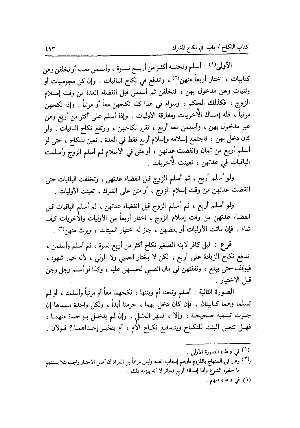 الصورة الاولى: أسلم وتحته أكثر من أربع نسوة، وأسلمن معه أو تخلفن وهن كتابيات، اختار أربعا منهن، واندفع في نكاح الباقيات. وإن كن مجوسيات أو وثنيات وهن مدخول بهن، فتخلفن ثم أسلمن قبل انقضاء العدة من وقت إسلام الزوج، فكذلك الحكم، وسواء في هذا كله نكحهن معا أو مرتبا. وإذا نكحهن مرتبا، فله إمساك الاخريات ومفارقة الاوليات. وإذا أسلم على أكثر من أربع وهن غير مدخول بهن، وأسلمن معه أربع، تقرر نكاحهن، وارتفع نكاح الباقيات. ولو كان دخل بهن، فاجتمع إسلامه وإسلام أربع فقط في العدة، تعين للنكاح، حتى لو أسلم أربع من ثمان وانقضت عدتهن، أو متن في الاسلام ثم أسلم الزوج وأسلمت الباقيات في عدتهن، تعينت الاخريات. ولو أسلم أربع، ثم أسلم الزوج قبل انقضاء عدتهن، وتخلفت الباقيات حتى انقضت عدتهن من وقت إسلام الزوج، أو متن على الشرك، تعينت الاوليات. ولو أسلم أربع، ثم أسلم الزوج قبل انقضاء عدتهن، ثم أسلم الباقيات قبل انقضاء عدتهن من وقت إسلام الزوج، اختار أربعا من الاوليات والاخريات كيف شاء. فإن ماتت الاوليات أو بعضهن، جاز له اختيار الميتات، ويرث منهم. فرع قبل كافر لابنه الصغير نكاح أكثر من أربع نسوة، ثم أسلم وأسلمن، اندفع نكاح الزيادة على أربع، لكن لا يختار الصبي ولا الولي، لانه خيار شهوة، فيوقف حتى يبلغ، ونفقتهن في مال الصبي لحبسهن عليه، وكذا لو أسلم رجل وجن قبل الاختيار. الصورة الثانية: أسلم وتحته أم وبنتها، نكحهما معا أو مرتبا وأسلمتا، أو لم تسلما وهما كتابيتان، فإن كان دخل بهما، حرمتا أبدا. ولكل واحدة مسماها إن جرت تسمية صحيحة، وإلا، فمهر المثل. وإن لم يدخل بواحدة منهما، فهل تتعين البنت للنكاح ويندفع نكاح الام، أم يتخير إحداهما ؟ قولان.