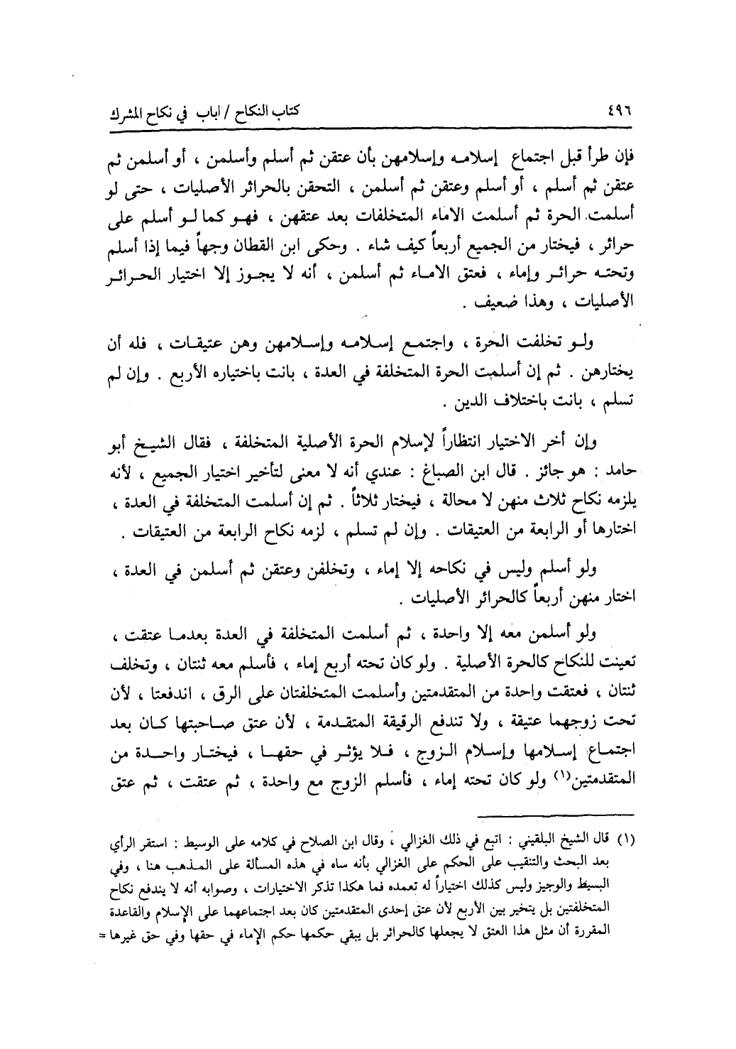 فإن طرأ قبل اجتماع إسلامه وإسلامهن بأن عتقن ثم أسلم وأسلمن، أو أسلمن ثم عتقن ثم أسلم، أو أسلم وعتقن ثم أسلمن، التحقن بالحرائر الاصليات، حتى لو أسلمت الحرة ثم أسلمت الاماء المتخلفات بعد عتقهن، فهو كما لو أسلم على حرائر، فيختار من الجميع أربعا كيف شاء. وحكى ابن القطان وجها فيما إذا أسلم وتحته حرائر وإماء، فعتق الاماء ثم أسلمن، أنه لا يجوز إلا اختيار الحرائر الاصليات، وهذا ضعيف. ولو تخلفت الحرة، واجتمع إسلامه وإسلامهن وهن عتيقات، فله أن يختارهن. ثم إن أسلمت الحرة المتخلفة في العدة، بانت باختياره الاربع. وإن لم تسلم، بانت باختلاف الدين. وإن أخر الاختيار انتظارا لاسلام الحرة الاصلية المتخلفة، فقال الشيخ أبو حامد: هو جائز. قال ابن الصباغ: عندي أنه لا معنى لتأخير اختيار الجميع، لانه يلزمه نكاح ثلاث منهن لا محالة، فيختار ثلاثا. ثم إن أسلمت المتخلفة في العدة، اختارها أو الرابعة من العتيقات. وإن لم تسلم، لزمه نكاح الرابعة من العتيقات. ولو أسلم وليس في نكاحه إلا إماء، وتخلفن وعتقن ثم أسلمن في العدة، اختار منهن أربعا كالحرائر الاصليات. ولو أسلمن معه إلا واحدة، ثم أسلمت المتخلفة في العدة بعدما عتقت، تعينت للنكاح كالحرة الاصلية. ولو كان تحته أربع إماء، فأسلم معه ثنتان، وتخلف ثنتان، فعتقت واحدة من المتقدمتين وأسلمت المتخلفتان على الرق، اندفعتا، لان تحت زوجهما عتيقة، ولا تندفع الرقيقة المتقدمة، لان عتق صاحبتها كان بعد اجتماع إسلامها وإسلام الزوت، فلا يؤثر في حقها، فيختار واحدة من المتقدمتين. ولو كان تحته إماء، فأسلم الزوج مع واحدة، ثم عتقت، ثم عتق