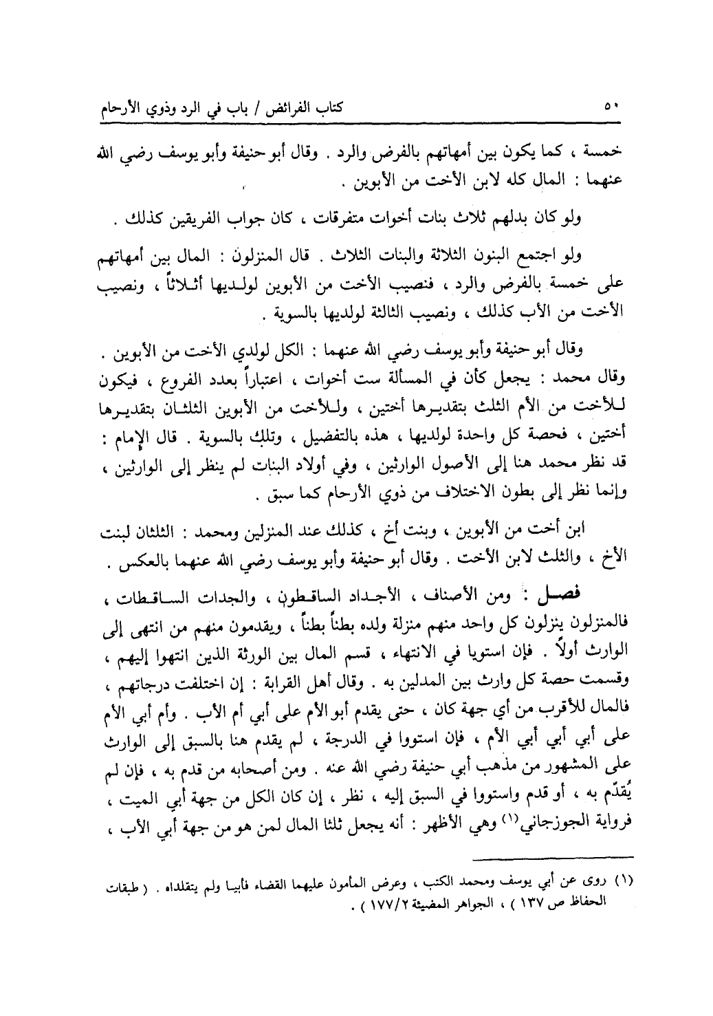 فصل ومن الاصناف، الاجداد الساقطون، والجدات الساقطات، فالمنزلون ينزلون كل واحد منهم منزلة ولده بطنا بطنا، ويقدمون منهم من انتهى إلى الوارث أولا. فان استويا في الانتهاء، قسم المال بين الورثة الذين انتهوا إليهم، وقسمت حصة كل وارث بين المدلين به. وقال أهل القرابة: إن اختلفت درجاتهم، فالمال للاقرب من أي جهة كان، حتى يقدم أو الام على أبي أم الاب. وأم أبي الام على أبي أبي أبي الام، فان استووا في الدرجة، لم يقدم هنا بالسبق إلى الوارث على المشهور من مذهب أبي حنيفة رضي الله عنه. ومن أصحابه من قدم به، فان لم يقدم به، أو قدم واستووا في السبق إليه، نظر، إن كان الكل من جهة أبي الميت، فرواية الجوزجاني وهي الاظهر: أنه يجعل ثلثا المال لمن هو من جهة أبي الاب،