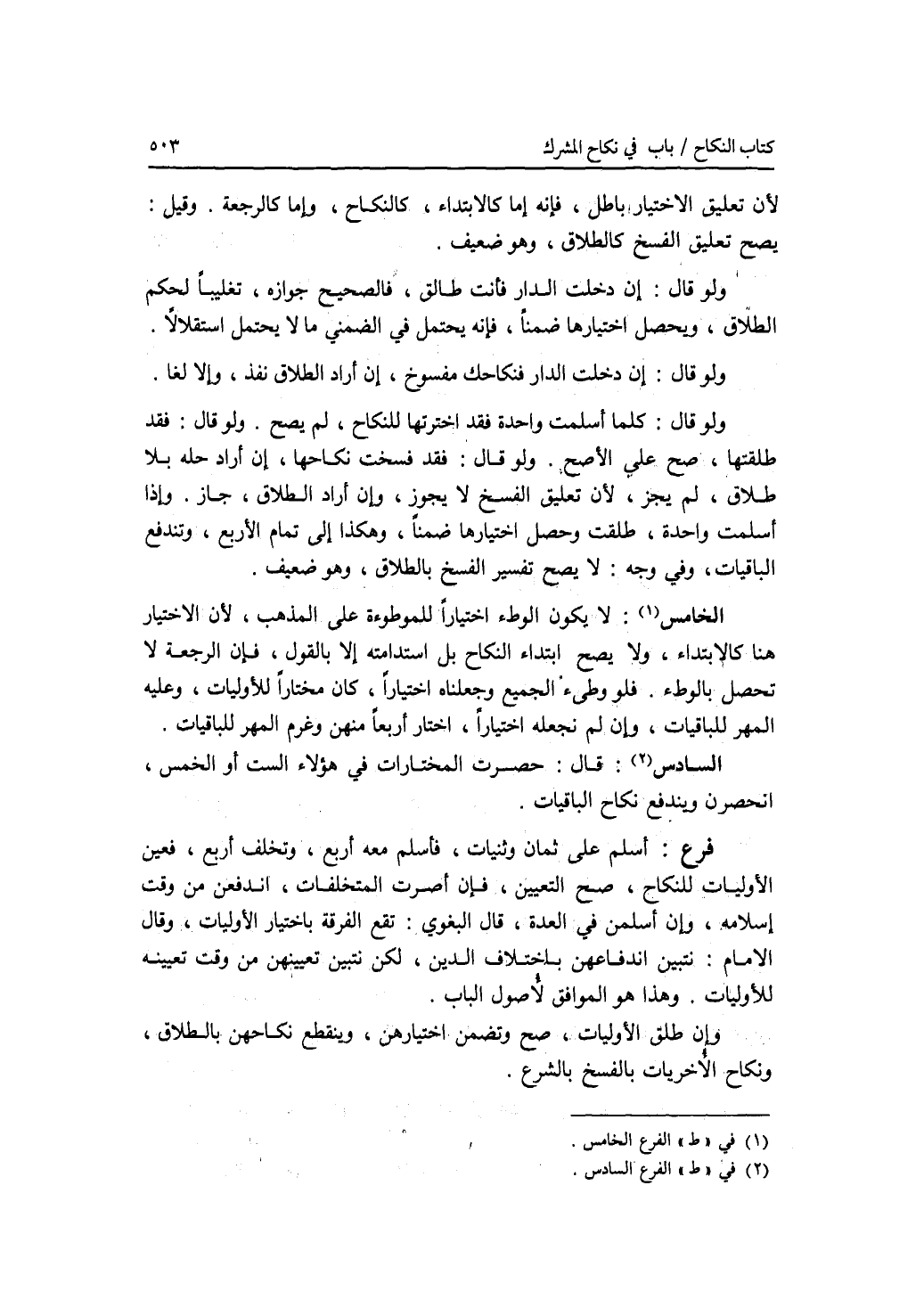 لان تعليق الاختيار باطل، فإنه إما كالابتداء، كالنكاح، وإما كالرجعة. وقيل: يصح تعليق الفسخ كالطلاق، وهو ضعيف. ولو قال: إن دخلت الدار فأنت طالق، فالصحيح جوازه، تغليبا لحكم الطلاق، ويحصل اختيارها ضمنا، فإنه يحتمل في الضمني ما لا يحتمل استقلالا. ولو قال: إن دخلت الدار فنكاحك مفسوخ، إن أراد الطلاق نفذ، وإلا لغا. ولو قال: كلما أسلمت واحدة فقد اخترتها للنكاح، لم يصح. ولو قال: فقد طلقتها، صح على الاصح. ولو قال: فقد فسخت نكاحها، إن أراد حله بلا طلاق، لم يجز، لان تعليق الفسخ لا يجوز، وإن أراد الطلاق، جاز. وإذا أسلمت واحدة، طلقت وحصل اختيارها ضمنا، وهكذا إلى تمام الاربع، وتندفع الباقيات، وفي وجه: لا يصح تفسير الفسخ بالطلاق، وهو ضعيف. (الفرع) الخامس: لا يكون الوطئ اختيارا للموطوءة على المذهب، لان الاختيار هنا كالابتداء، ولا يصح ابتداء النكاح بل استدامته إلا بالقول، فإن الرجعة لا تحصل بالوطئ. فلو وطئ الجميع وجعلناه اختيارا، كان مختارا للاوليات، وعليه المهر للباقيات، وإن لم نجعله اختيارا، اختار أربعا منهن وغرم المهر للباقيات. الفرع السادس: قال: حصرت المختارات في هؤلاء الست أو الخمس، انحصرن ويندفع نكاح الباقيات. فرع أسلم على ثمان وثنيات، فأسلم معه أربع، وتخلف أربع، فعين الاوليات للنكاح، صح التعيين. فإن أصرت المتخلفات، اندفعن من وقت إسلامه، وإن أسلمن في العدة، قال البغوي: تقع الفرقة باختيار الاوليات، وقال الامام: نتبين اندفاعهن باختلاف الدين، لكن نتبين تعيينهن من وقت تعيينه للاوليات. وهذا هو الموافق لاصول الباب. وإن طلق الاوليات، صح وتضمن اختيارهن، وينقطع نكاحهن بالطلاق، ونكاح الاخريات بالفسخ بالشرع.