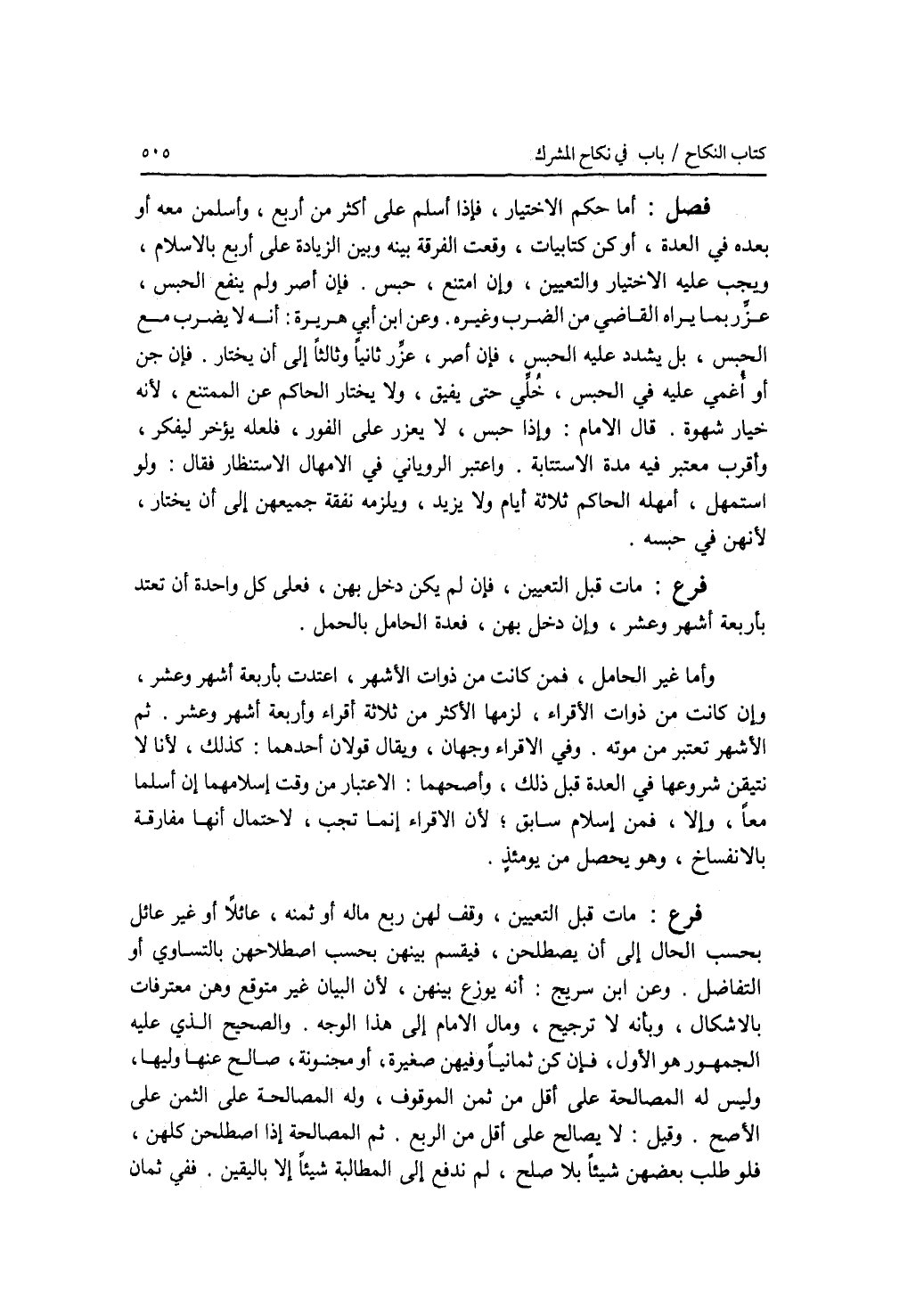 فصل أما حكم الاختيار، فإذا أسلم على أكثر من أربع، وأسلمن معه أو بعده في العدة، أو كن كتابيات، وقعت الفرقة بينه وبين الزيادة على أربع بالاسلام، ويجب عليه الاختيار والتعيين، وإن امتنع، حبس. فإن أصر ولم ينفع الحبس، عزر بما يراه القاضي من الضرب وغيره. وعن ابن أبي هريرة: أنه لا يضرب مع الحبس، بل يشدد عليه الحبس، فإن أصر، عزر ثانيا وثالثا إلى أن يختار. فإن جن أو أغمي عليه في الحبس، خلي حتى يفيق، ولا يختار الحاكم عن الممتنع، لانه خيار شهوة. قال الامام: وإذا حبس، لا يعزر على الفور، فلعله يؤخر ليفكر، وأقرب معتبر فيه مدة الاستتابة. واعتبر الروياني في الامهال الاستنظار فقال: ولو استمهل، أمهله الحاكم ثلاثة أيام ولا يزيد، ويلزمه نفقة جميعهن إلى أن يختار، لانهن في حبسه. فرع مات قبل التعيين، فإن لم يكن دخل بهن، فعلى كل واحدة أن تعتد بأربعة أشهر وعشر، وإن دخل بهن، فعدة الحامل بالحمل. وأما غير الحامل، فمن كانت من ذوات الاشهر، اعتدت بأربعة أشهر وعشر، وإن كانت من ذوات الاقراء، لزمها الاكثر من ثلاثة أقراء وأربعة أشهر وعشر. ثم الاشهر تعتبر من موته. وفي الاقراء وجهان، ويقال: قولان، أحدهما: كذلك، لانا لا نتيقن شروعها في العدة قبل ذلك، وأصحهما: الاعتبار من وقت إسلامهما إن أسلما معا، وإلا، فمن إسلام سابق، لان الاقراء إنما تجب، لاحتمال أنها مفارقة بالانفساخ، وهو يحصل من يومئذ. فرع مات قبل التعيين، وقف لهن ربع ماله أو ثمنه، عائلا أو غير عائل بحسب الحال إلى أن يصطلحن، فيقسم بينهن بحسب اصطلاحهن بالتساوي أو التفاضل. وعن ابن سريج: أنه يوزع بينهن، لان البيان غير متوقع وهن معترفات بالاشكال، وبأنه لا ترجيح، ومال الامام إلى هذا الوجه. والصحيح الذي عليه الجمهور هو الاول، فإن كن ثمانيا وفيهن صغيرة، أو مجنونة، صالح عنها وليها، وليس له المصالحة على أقل من ثمن الموقوف، وله المصالحة على الثمن على الاصح. وقيل: لا يصالح على أقل من الربع. ثم المصالحة إذا اصطلحن كلهن، فلو طلب بعضهن شيئا بلا صلح، لم ندفع إلى المطالبة شيئا إلا باليقين. ففي ثمان