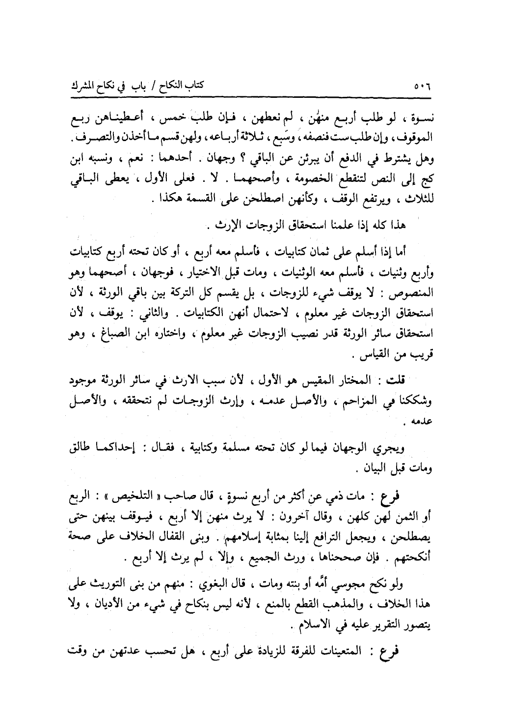 نسوة، لو طلب أربع منهن، لم نعطهن، فإن طلب خمس، أعطيناهن ربع الموقوف، وإن طلب ست، فنصفه، وسبع، ثلاثة أرباعه، ولهن قسم ما أخذن والتصرف. وهل يشترط في الدفع أن يبرئن عن الباقي ؟ وجهان. أحدهما: اعم، ونسبه ابن كج إلى النص لتنقطع الخصومة، وأصحهما: لا. فعلى الاول، يعطى الباقي للثلاث، ويرتفع الوقف، وكأنهن اصطلحن على القسمة هكذا. هذا كله إذا علمنا استحقاق الزوجات الارث. أما إذا أسلم على ثمان كتابيات، فأسلم معه أربع، أو كان تحته أربع كتابيات وأربع وثنيات، فأسلم معه الوثنيات، ومات قبل الاختيار، فوجهان، أصحهما وهو المنصوص: لا يوقف شئ للزوجات، بل يقسم كل التركة بين باقي الورثة، لان إستحقاق الزوجات غير معلوم، لاحتمال أنهن الكتابيات. والثاني: يوقف، لان إستحقاق سائر الورثة قدر نصيب الزوجا ت غير معلوم، واختاره ابن الصباغ، وهو قريب من القياس. قلت: المختار المقيس هو الاول، لان سبب الارث في سائر الورثة موجود وشككنا في المزاحم، والاصل عدمه، وإرث الزوجات لم نتحققه، والاصل عدمه. والله أعلم. ويجري الوجهان فيما لو كان تحته مسلمة وكتابية، فقال: إحداكما طالق، ومات قبل البيان. فرع مات ذمي عن أكثر من أربع نسوة، قال صاحب التلخيص: الربع أو الثمن لهن كلهن، وقال آخرون: لا يرث منهن إلا أربع، فيوقف بينهن حتى يصطلحن، ويجعل الترافع إلينا بمثابة إسلامهم. وبنى القفال الخلاف على صحة أنكحتهم. فإن صححناها، ورث الجميع، وإلا، لم يرث إلا أربع. ولو نكح مجوسي أمه أو بنته ومات، قال البغوي: منهم من بنى التوريث على هذا الخلاف، والمذهب القطع بالمنع، لانه ليس بنكاح في شئ من الاديان، ولا يتصور التقرير عليه في الاسلام. فرع المتعينات للفرقة للزيادة على أربع، هل تحسب عدتهن من وقت