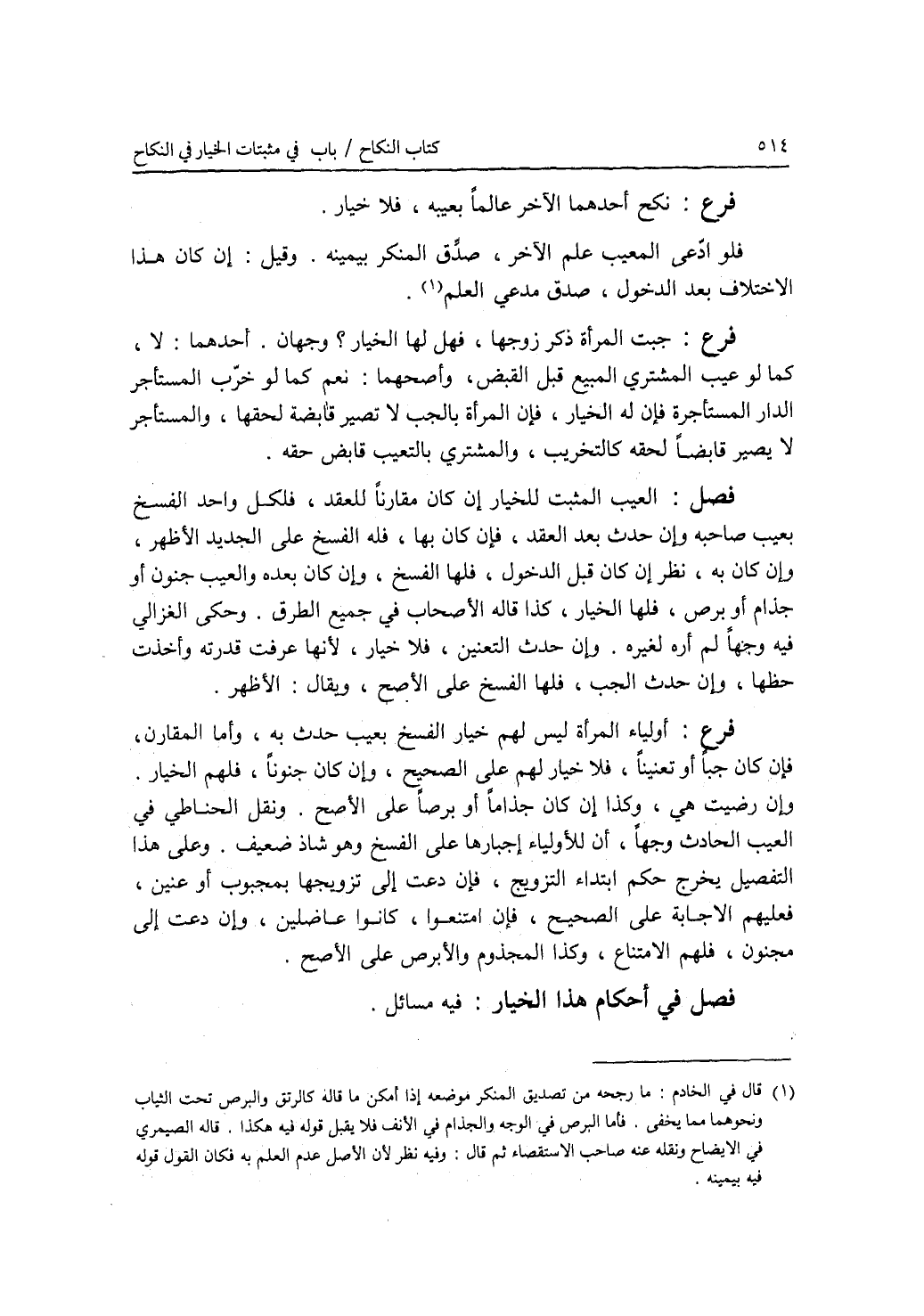 فرع نكح أحدهما الآخر عالما بعيبه، فلا خيار. فلو ادعى المعيب علم الآخر، صدق المنكر بيمينه. وقيل: إن كان هذا الاختلاف بعد الدخول، صدق مدعي العلم. فرع جبت المرأة ذكر زوجها، فهل لها الخيار ؟ وجهان. أحدهما: لا، كما لو عيب المشتري المبيع قبل القبض، وأصحهما: نعم كما لو خرب المستأجر الدار المستأجرة فإن له الخيار، فإن المرأة بالجب لا تصير قابضة لحقها، والمستأجر لا يصير قابضا لحقه كالتخريب، والمشتري بالتعيب قابض حقه. فصل العيب المثبت للخيار إن كان مقارنا للعقد، فلكل واحد الفسخ بعيب صاحبه وإن حدث بعد العقد، فإن كان بها، فله الفسخ على الجديد الاظهر، وإن كان به، نظر إن كان قبل الدخول، فلها الفسخ، وإن كان بعده والعيب جنون أو جذام أو برص، فلها الخيار، كذا قاله الاصحاب في جميع الطرق. وحكى الغزالي فيه وجها لم أره لغيره. وإن حدث التعنين، فلا خيار، لانها عرفت قدرته وأخذت حظها، وإن حدث الجب، فلها الفسخ على الاصح، ويقال: الاظهر. فرع أولياء المرأة ليس لهم خيار الفسخ بعيب حدث به، وأما المقارن، فإن كان جبا أو تعنينا، فلا خيار لهم على الصحيح، وإن كان جنونا، فلهم الخيار. وإن رضيت هي، وكذا إن كان جذاما أو برصا على الاصح. ونقل الحناطي في العيب الحادث وجها، أن للاولياء إجبارها على الفسخ وهو شاذ ضعيف. وعلى هذا التفصيل يخرج حكم ابتداء التزويج، فإن دعت إلى تزويجها بمجبوب أو عنين، فعليهم الاجابة على الصحيح، فإن امتنعوا، كانوا عاضلين، وإن دعت إلى مجنون، فلهم الامتناع، وكذا المجذوم والابرص على الاصح. فصل في أحكام هذا الخيار فيه مسائل.