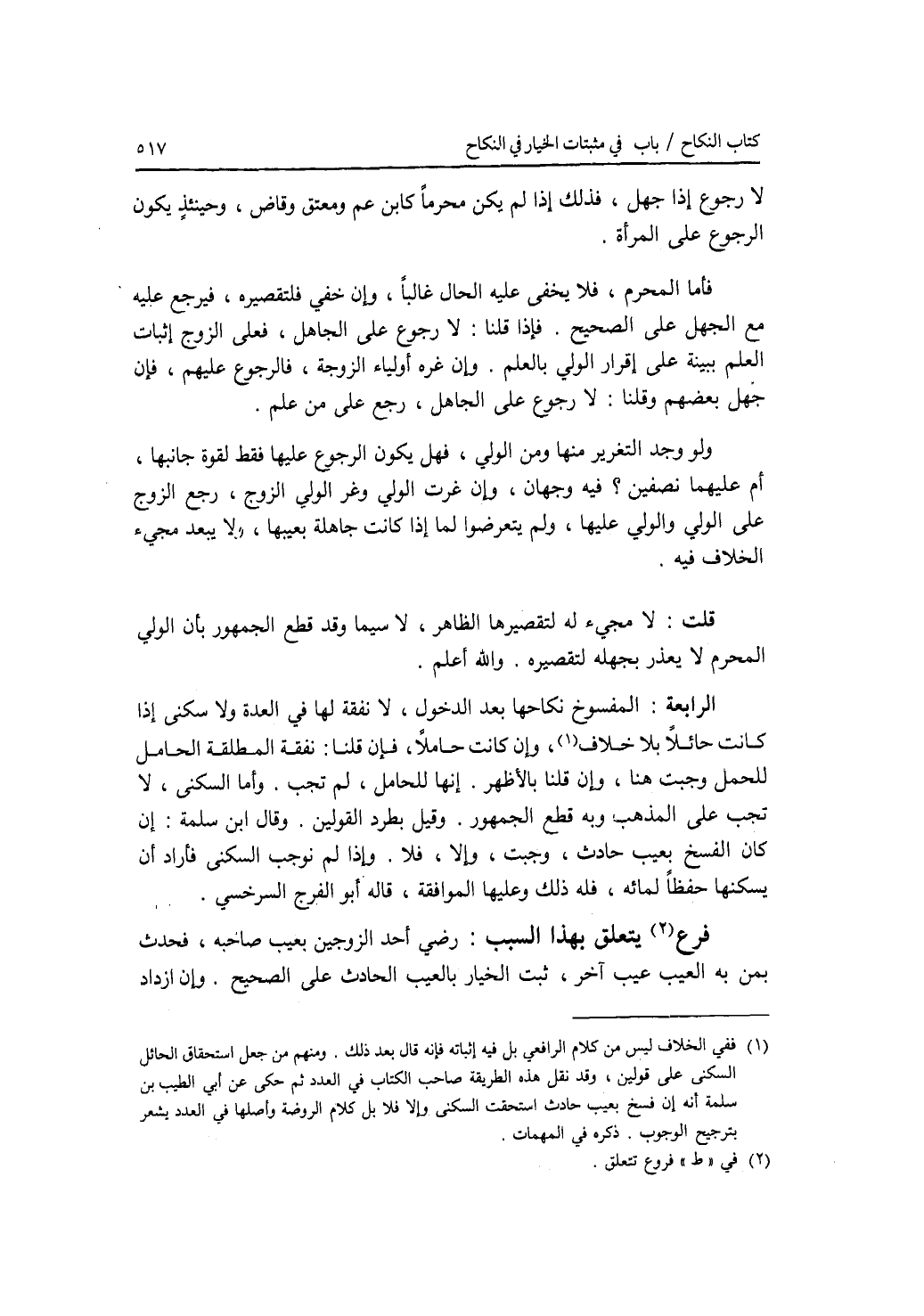 لا رجوع إذا جهل، فذلك إذا لم يكن محرما كابن عم ومعتق وقاض، وحينئذ يكون الرجوع على المرأة. فأما المحرم، فلا يخفى عليه الحال غالبا، وإن خفي فلتقصيره، فيرجع عليه مع الجهل على الصحيح. فإذا قلنا: لا رجوع على الجاهل، فعلى الزوج إثبات العلم ببينة على إقرار الولي بالعلم. وإن غره أولياء الزوجة، فالرجوع عليهم، فإن جهل بعضهم وقلنا: لا رجوع على الجاهل، رجع على من علم. ولو وجد التغرير منها ومن الولي، فهل يكون الرجوع عليها فقط لقوة جانبها، أم عليهما نصفين ؟ فيه وجهان، وإن غرت الولي وغر الولي الزوج، رجع الزوج على الولي والولي عليها، ولم يتعرضوا لما إذا كانت جاهلة بعيبها، ولا يبعد مجئ الخلاف فيه. قلت: لا مجئ له لتقصيرها الظاهر، لا سيما وقد قطع الجمهور بأن الولي المحرم لا يعذر بجهله لتقصيره. والله أعلم. الرابعة: المفسوخ نكاحها بعد الدخول، لا نفقة لها في العدة ولا سكنى إذا كانت حائلا بلا خلاف، وإن كانت حاملا، فإن قلنا: نفقة المطلقة الحامل للحمل وجبت هنا، وإن قلنا بالاظهر. إنها للحال، لم تجب. وأما السكنى، لا تجب على المذهب وبه قطع الجمهور. وقيل بطرد القولين. وقال ابن سلمة: إن كان الفسخ بعيب حادث، وجبت، وإلا، فلا. وإذا لم نوجب السكنى فأراد أن يسكنها حفظا لمائه، فله ذلك وعليها الموافقة، قاله أبو الفرج السرخسي. فروع تتعلق بهذا السبب رضي أحد الزوجين بعيب صاحبه، فحدث إسمعيل به العيب عيب آخر، ثبت الخيار بالعيب الحادث على الصحيح. وإن ازداد