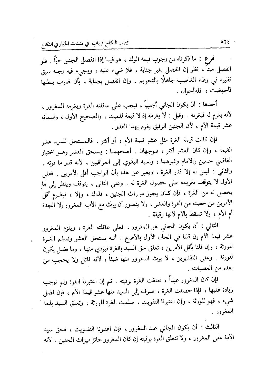 فرع ما ذكرناه من وجوب قيمة الولد، هو فيما إذا انفصل الجنين حيا. فلو انفصل ميتا، نظر إن انفصل بغير جناية، فلا شئ عليه، ويجئ فيه وجه سبق نظيره في وطئ الغاصب جاهلا بالتحريم. وإن انفصل بجناية، بأن ضرب بطنها فأجهضت، فله أحوال. أحدها: أن يكون الجاني أجنبيا، فيجب على عاقلته الغرة ويغرمه المغرور، لانه يغرم له فيغرمه. وقيل: لا يغرمه إذ لا قيمة للميت، والصحيح الاول، وضمانه عشر قيمة الام، لان الجنين الرقيق يغرم بهذا القدر. فإن كانت قيمة الغرة مثل عشر قيمة الام، أو أكثر، فالمستحق للسيد عشر القيمة، وإن كان العشر أكثر، فوجهان. أصحهما: يستحق العشر وهو اختيار القاضي حسين والامام وغيرهما، ونسبه البغوي إلى العراقيين، لانه قدر ما فوته. والثاني: ليس له إلا قدر الغرة، ويعبر عن هذا بأن الواجب أقل الامرين. فعلى الاول لا يتوقف تغريمه على حصول الغرة له. وعلى الثاني، يتوقف وينظر إلى ما يحصل له من الغرة، فإن كان يجوز ميراث الجنين، فذاك، وإلا، فيغرم أقل الامرين من حصته من الغرة والعشر، ولا يتصور أن يرث مع الاب المغرور إلا الجدة أم الام، ولا تسقط بالام لانها رقيقة. الثاني: أن يكون الجاني هو المغرور، فعلى عاقلته الغرة، ويلزم المغرور عشر قيمة الام إن قلنا في الحال الاول بالاصح: أنه يستحق العشر وتسلم الغرة للورثة، وإن قلنا بأقل الامرين، تعلق حق السيد بالغرة فيؤدي منها، وما فضل يكون للورثة. وعلى التقديرين، لا يرث المغرور منها شيئا، لانه قاتل ولا يحجب من بعده من العصبات. فإن كان المغرور عبدا، تعلقت الغرة برقبته. ثم إن اعتبرنا الغرة ولم نوجب زيادة عليها، فإذا حصلت الغرة، صرف إلى السيد منها عشر قيمة الام، فإن فضل شئ، فهو للورثة، وإن اعتبرنا التفويت، سلمت الغرة للورثة، وتعلق حق السيد بذمة المغرور. الثالث: أن يكون الجاني عبد المغرور، فإن اعتبرنا التفويت، فحق سيد الامة على المغرور، ولا تتعلق الغرة برقبته إن كان المغرور حائز ميراث الجنين، لانه