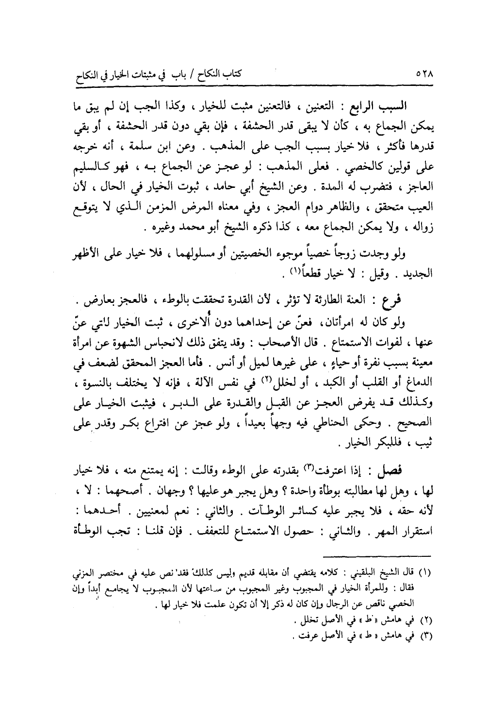 السبب الرابع: التعنين، فالتعنين مثبت للخيار، وكذا الجب إن لم يبق ما يمكن الجماع به، كأن لا يبقى قدر الحشفة، فإن بقي دون قدر الحشفة، أو بقي قدرها فأكثر، فلا خيار بسبب الجب على المذهب. وعن ابن سلمة، أنه خرجه على قولين كالخصي. فعلى المذهب: لو عجز عن الجماع به، فهو كالسليم العاجز، فتضرب له المدة. وعن الشيخ أبي حامد، ثبوت الخيار في الحال، لان العيب متحقق، والظاهر دوام العجز، وفي معناه المرض المزمن الذي لا يتوقع زواله، ولا يمكن الجماع معه، كذا ذكره الشيخ أبو محمد وغيره. ولو وجدت زوجها خصيا موجوء الخصيتين أو مسلولهما، فلا خيار على الاظهر الجديد. وقيل: لا خيار قطعا. فرع العنة الطارئة لا تؤثر، لان القدرة تحققت بالوطئ، فالعجز بعارض. ولو كان له إمرأتان، فعن عن إحداهما دون الاخرى، ثبت الخيار للتي عن عنها، لفوات الاستمتاع. قال الاصحاب: وقد يتفق ذلك لانحباس الشهوة عن إمرأة معينة بسبب نفرة أو حياء، ويقدر على غيرها لميل أو أنس. فأما العجز المحقق لضعف في الدماغ أو القلب أو الكبد، أو لخلل في نفس الآلة، فإنه لا يختلف بالنسوة، وكذلك قد يفرض العجز عن القبل والقدرة على الدبر، فيثبت الخيار على الصحيح. وحكى الحناطي فيه وجها بعيدا، ولو عجز عن افتراع بكر وقدر على ثيب، فللبكر الخيار فصل إذا اعترفت بقدرته على الوطئ وقالت: إنه يمتنع منه، فلا خيار لها، وهل لها مطالبته بوطأة واحدة ؟ وهل يجبر هو عليها ؟ وجهان. أصحهما: لا، لانحقه، فلا يجبر عليه كسائر الوطآت. والثاني: نعم لمعنيين. أحدهما: استقرار المهر. والثاني: حصول الاستمتاع للتعفف. فإن قلنا: تجب الوطأة