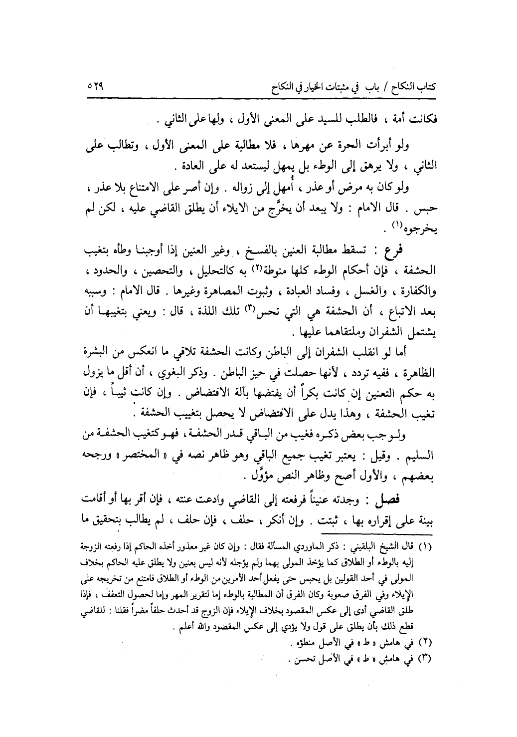 فكانت أمة، فالطلب للسيد على المعنى الاول، ولها على الثاني. ولو أبرأت الحرة عن مهرها، فلا مطالبة على المعنى الاول، وتطالب على الثاني، ولا يرهق إلى الوطئ بل يمهل ليستعد له على العادة. ولو كان به مرض أو عذر، أمهل إلى زواله. وإن أصر على الامتناع بلا عذر، حبس. قال الامام: ولا يبعد أن يخرج من الايلاء أن يطلق القاضي عليه، لكن لم يخرجوه. فرع تسقط مطالبة العنين بالفسخ، وغير العنين إذا أوجبنا وطأه بتغييب الحشفة، فإن أحكام الوطئ كلها منوطة به كالتحليل، والتحصين والحدود، والكفارة، والغسل، وفساد العبادة، وثبوت المصاهرة وغيرها. قال الامام: وسببه بعد الاتباع، أن الحشفة هي التي تحس تلك اللذة، قال: ويعني بتغيبها أن يشتمل الشفران وملتقاهما عليها. أما لو انقلب الشفران إلى الباطن وكانت الحشفة تلاقي ما انعكس من البشرة الظاهرة، ففيه تردد، لانها حصلت في حيز الباطن. وذكر البغوي، أن أقل ما يزول به حكم التعنين إن كانت بكرا أن يقتضها بآلة الاقتضاض. وإن كانت ثيبا، فأن تغيب الحشفة، وهذا يدل على الاقتضاض لا يحصل بتغيب الحشفة. ولوجب بعض ذكره فغيب من الباقي قدر الحشفة، فهو كتغيب الحشفة من السليم. وقيل: يعتبر تغيب جميع الباقي وهو ظاهر نصه في المختصر ورجحه بعضهم، والاول أصح وظاهر النص مؤول. فصل وجدته عنينا فرفعته إلى القاضي وادعت عنته، فإن أقر بها أو أقامت بينة على إقراره بها، ثبتت. وإن أنكر، حلف، فإن حلف، لم يطالب بتحقيق ما
