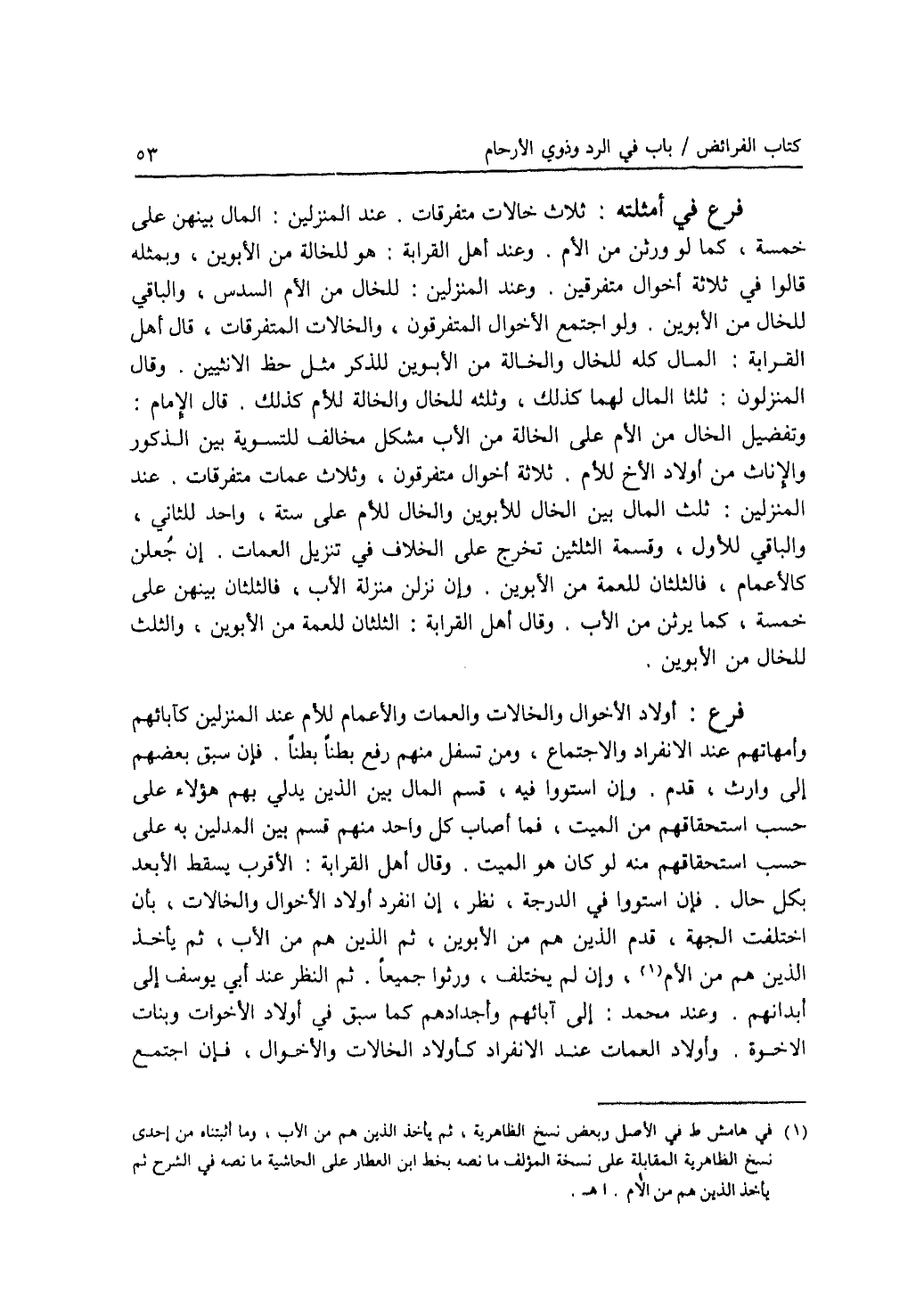 فرع في أمثلته ثلاث خالات متفرقات. عند المنزلين: المال بينهن على خمسة، كما لو ورثن من الام. وعند أهل القرابة: هو للخالة من الابوين، وبمثله قالوا في ثلاثة أخوال متفرقين. وعند المنزلين: للخال من الام السدس، والباقي للخال من الابوين. ولو اجتمع الاخوال المتفرقون، والخالات المتفرقات، قال أهل القرابة: المال كله للخال والخالة من الابوين للذكر مثل حظ الانثيين. وقال المنزلون: ثلثا المال لهما كذلك، وثلثه للخال والخالة للام كذلك. قال الامام: وتفضيل الخال من الام على الخالة من الاب مشكل مخالف للتسوية بين الذكور والاناث من أولاد الاخ للام. ثلاثة أخوال متفرقون، وثلاث عمات متفرقات. عند المنزلين: ثلث المال بين الخال للابوين والخال للام على ستة، واحد للثاني، والباقي للاول: وقسمة الثلثين تخرج على الخلاف في تنزيل العمات. إن جعلن كالاعمام، فالثلثان للعمة من الابوين. وإن نزلن منزلة الاب، فالثلثان بينهن على خمسة، كما يرثن من الاب. وقال أهل القرابة: الثلثان للعمة من الابوين، والثلث للخال من الابوين. فرع أولاد الاخوال والخالات والعمات والاعمام للام عند المنزلين كآبائهم وأمهاتهم عند الانفراد والاجتماع، ومن تسفل منهم رفع بطنا بطنا. فان سبق بعضهم إلى وارث، قدم. وإن استووا فيه، قسم المال بين الذين يدلي بهم هؤلاء على حسب استحقاقهم من الميت فما أصاب كل واحد منهم قسم بين المدلين به على حسب استحقاقهم منه لو كان هو الميت. وقال أهل القرابة: الاقرب يسقط الابعد بكل حال. فان استووا في الدرجة، نظر، إن انفرد أولاد الاخوال والخالات، بأن اختلفت الجهة، قدم الذين هم من الابوين، ثم الذين هم من الاب، ثم يأخذ الذين هم من الام، وإن لم يختلف، ورثوا جميعا. ثم النظر عند أبي يوسف إلى أبدانهم. وعند محمد: إلى آبائهم وأجدادهم كما سبق في أولاد الاخوات وبنات الاخوة. وأولاد العمات عند الانفراد كأولاد الخالات والاخوال، فان اجتمع
