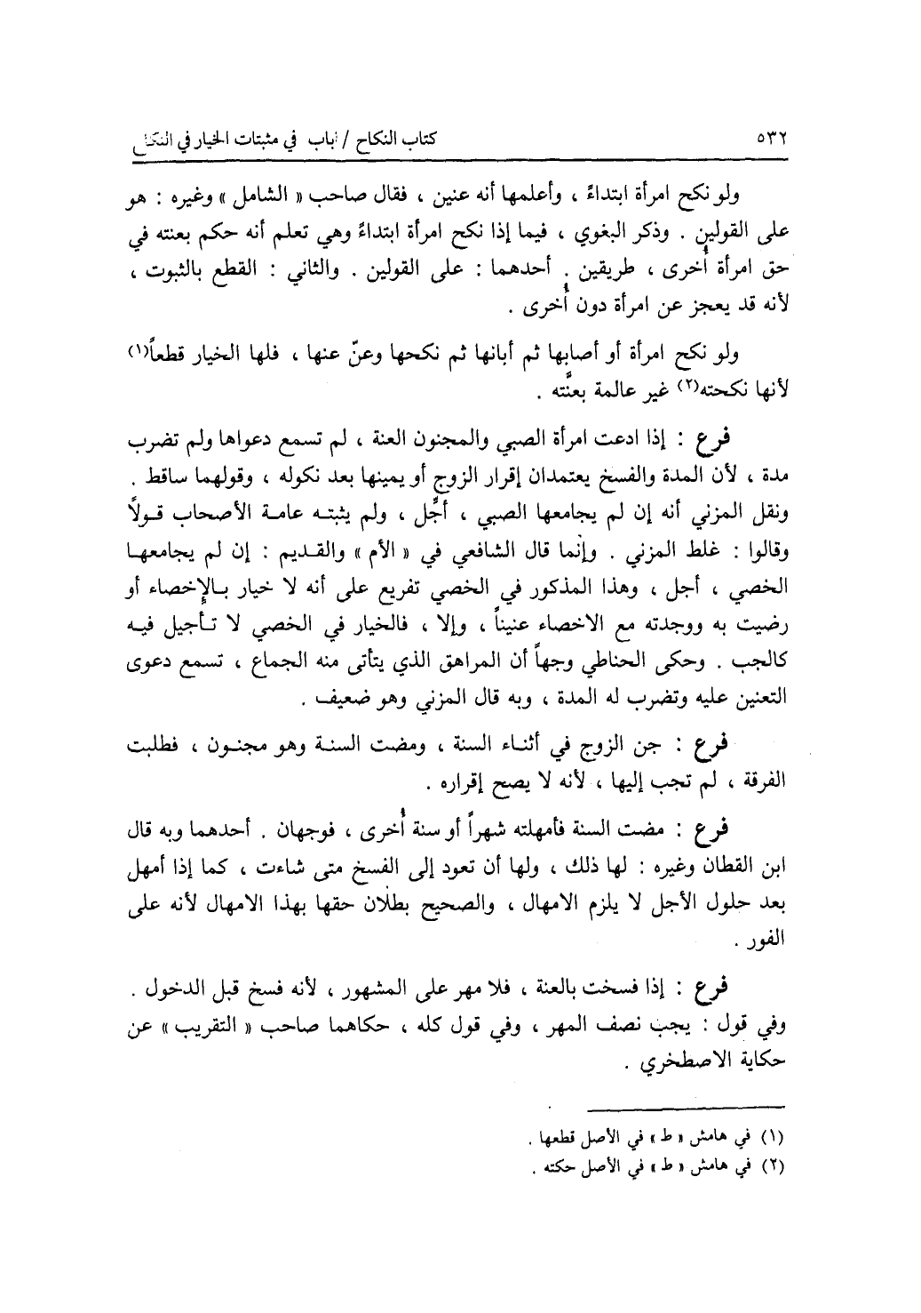 ولو نكح إمرأة ابتداء، وأعلمها أنه عنين، فقال صاحب الشامل وغيره: هو على القولين. وذكر البغوي، فيما إذا نكح إمرأة ابتداء وهي تعلم أنه حكم بعنته في حق إمرأة أخرى، طريقين. أحدهما: على القولين. والثاني: القطع بالثبوت، لانه قد يعجز عن إمرأة دون أخرى. ولو نكح إمرأة أو أصابها ثم أبانها ثم نكحها وعن عنها، فلها الخيار قطعا لانها نكحته غير عالمة فرع إذا ادعت إمرأة الصبي والمجنون العنة، لم تسمع دعواها ولم تضرب بعنته مدة، لان المدة والفسخ يعتمدان إقرار الزوج أو يمينها بعد نكوله، وقولهما ساقط. ونقل المزني أنه إن لم يجامعها الصبي، أجل، ولم يثبته عامة الاصحاب قولا وقالوا: غلط المزني. وإنما قال الشافعي في الام والقديم: إن لم يجامعها الخصي، أجل، وهذا المذكور في الخصي تفريع على أنه لا خيار بالاخصاء أو رضيت به ووجدته مع الاخصاء عنينا، وإلا، فالخيار في الخصي لا تأجيل فيه كالجب. وحكى الحناطي وجها أن المراهق الذي يتأتى منه الجماع، تسمع دعوى التعنين عليه وتضرب له المدة، وبه قال المزني وهو ضعيف. فرع جن الزوج في أثناء السنة، ومضت السنة وهو مجنون، فطلبت الفرقة، لم تجب إليها، لانه لا يصح إقراره. فرع مضت السنة فأمهلته شهرا أو سنة أخرى، فوجهان. أحدهما وبه قال ابن القطان وغيره: لها ذلك، ولها أن تعود إلى الفسخ متى شاءت، كما إذا أمهل بعد حلول الاجل لا يلزم الامهال، والصحيح بطلان حقها بهذا الامهال لانه على الفور. فرع إذا فسخت بالعنة، فلا مهر على المشهور، لانه فسخ قبل الدخول. وفي قول: يجب نصف المهر، وفي قول كله، حكاهما صاحب التقريب عن حكجية الاصطخري.