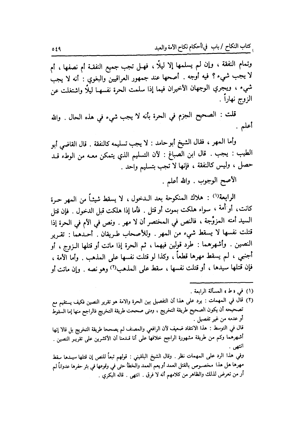 وتمام النفقة، وإن لم يسلمها إلا ليلا، فهل تجب جميع النفقة أم نصفها، أم لا يجب شئ ؟ فيه أوجه. أصحها عند جمهور العراقيين والبغوي: أنه لا يجب شئ، ويجري الوجهان الاخيران فيما إذا سلمت الحرة نفسها ليلا واشتغلت عن الزوج نهارا. قلت: الصحيح الجزم في الحرة بأنه لا يجب شئ في هذه الحال. والله أعلم. وأما المهر، فقال الشيخ أبو حامد: لا يجب تسليمه كالنفقة. وقال القاضي أبو الطيب: يجب. قال ابن الصباغ: لان التسليم الذي يتمكن معه (من) الوطئ قد حصل، وليس كالنفقة، فإنها لا تجب بتسليم واحد. قلت: الاصح الوجوب. والله أعلم. المسألة الرابعة: هلاك المنكوحة بعد الدخول، لا يسقط شيئا من المهر حرة كانت، أو أمة، سواء هلكت بموت أو قتل. فأما إذا هلكت قبل الدخول، فإن قتل السيد أمته المزوجة، فالنص في المختصر أن لا مهر. ونص في الام في الحرة إذا قتلت نفسها لا يسقط شئ من المهر. وللاصحاب طريقان. أحدهما: تقرير النصين. وأشهرهما: طرد قولين فيهما، ثم الحرة إذا ماتت أو قتلها الزوج، أو أجنبي، لم يسقط مهرها قطعا، وكذا لو قتلت نفسها على المذهب. وأما الامة، فإن قتلها سيدها، أو قتلت نفسها، سقط على المذهب وهو نصه. وإن ماتت أو