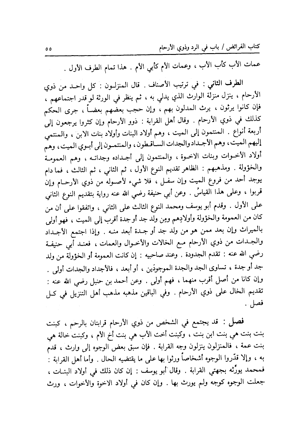 الطرف الثاني : في ترتيب الاصناف. قال المنزلون: كل واحد من ذوي الارحام، ينزل منزلة الوارث الذي يدلي به، ثم ينظر في الورثة لو قدر اجتماعهم، فان كانوا يرثون، يرث المدلون بهم، وإن حجب بعضهم بعضا، جرى الحكم كذلك في ذوي الارحام. وقال أهل القرابة: ذوو الارحام وإن كثروا يرجعون إلى أربعة أنواع. المنتمون إلى الميت، وهم أولاد البنات وأولاد بنات الابن، والمنتمي إليهم الميت، وهم الاجداد والجدات الساقطون، والمنتمون إلى أبوي الميت، وهم أولاد الاخوات وبنات الاخوة، والمنتمون إلى أجداده وجداته، وهم العمومة والخؤولة. ومذهبهم: الظاهر تقديم النوع الاول، ثم الثاني، ثم الثالث، فما دام يوجد أحد من فروع الميت وإن سفل، فلا شئ لاصوله من ذوي الارحام وإن قربوا، وعلى هذا القياس. وعن أبي حنيفة رضي الله عنه رواية بتقديم النوع الثاني على الاول. وقدم أبو يوسف ومحمد النوع الثالث على الثاني، واتفقوا على أن من كان من العمومة والخؤولة وأولادهم ومن ولد جد أو جدة أقرب إلى الميت، فهو أولى بالميراث وإن بعد ممن هو من ولد جد أو جدة أبعد منه. وإذا اجتمع الاجداد والجدات من ذوي الارحام مع الخالات والاخوال والعمات، فعند أبي حنيفة رضي الله عنه: تقدم الجدودة. وعند صاحبيه: إن كانت العمومة أو الخؤولة من ولد جد أو جدة، تساوى الجد والجدة الموجودين، أو أبعد، فالاجداد والجدات أولى. وإن كانا من أصل أقرب منهما، فهم أولى. وعن أحمد بن حنبل رضي الله عنه: تقديم الخال على ذوي الارحام. وفي الباقين مذهبه مذهب أهل التنزيل في كل فصل.