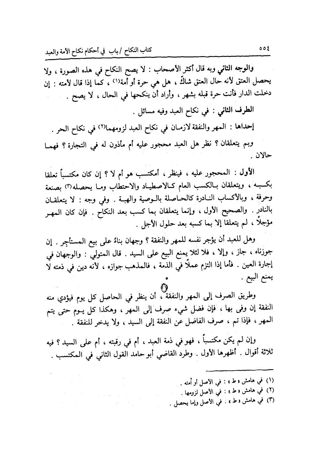 الطرف الثاني : في نكاح العبد وفيه مسائل. إحداها: المهر والنفقة لازمان في نكاح العبد لزومهما في نكاح الحر. وبما يتعلقان ؟ نظر هل العبد محجور عليه أم مأذون له في التجارة ؟ فهما حالان. الاول: المحجور عليه، فينظر، أمكتسب هو أم لا ؟ إن كان مكتسبا تعلقا بكسبه، ويتعلقان بالكسب العام كالاصطياد والاحتطاب وما يحصله بصنعة وحرفة، وبالاكساب النادرة كالحاصلة بالوصية والهبة. وفي وجه: لا يتعلقان بالنادر. والصحيح الاول، وإنما يتعلقان بما كسب بعد النكاح. فإن كان المهر مؤجلا، لم يتعلقا إلا بما كسبه بعد حلول الاجل. وهل للعبد أن يؤجر نفسه للمهر والنفقة ؟ وجهان بناء على بيع المستأجر. إن جوزناه، جاز، وإلا، فلا لئلا يمنع البيع على السيد. قال المتولي: والوجهان في إجارة العين. فأما إذا التزم عملا في الذمة، فالمذهب جوازه، لانه دين في ذمته لا يمنع البيع. وطريق الصرف إلى المهر والنفقة، أن ينظر في الحاصل كل يوم فيؤدي منه النفقة إن وفى بها، فإن فضل شئ صرف إلى المهر، وهكذا كل يوم حتى يتم المهر، فإذا تم، صرف الفاضل عن النفقة إلى السيد، ولا يدخر للنفقة. وإن لم يكن مكتسبا، فهو في ذمة العبد، أم في رقبته، أم على السيد ؟ فيه ثلاثة أقوال. أظهرها الاول. وطرد القاضي أبو حامد القول الثاني في المكتسب.