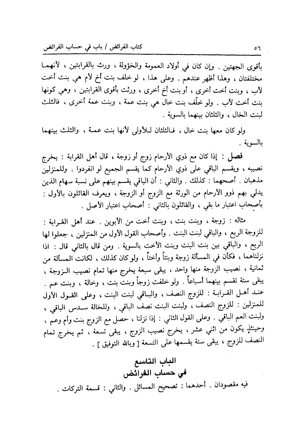 الباب التاسع : في حساب الفرائض فيه مقصودان. أحدهما: تصحيح المسائل. والثاني: قسمة التركات.