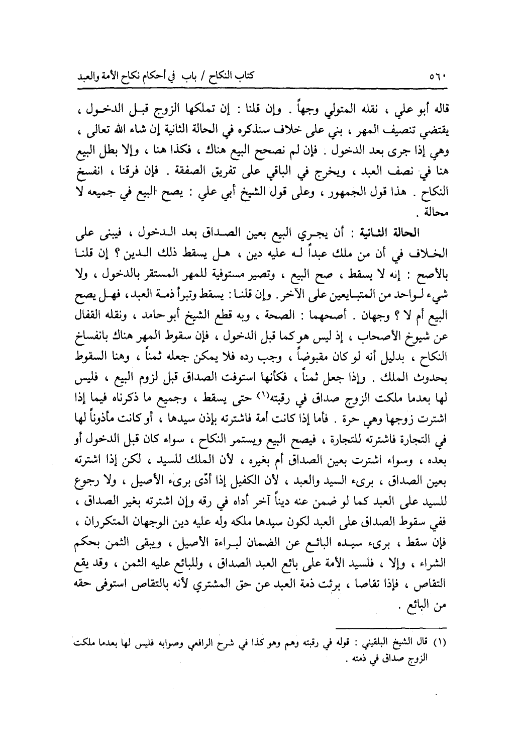 قاله أبو علي، نقله المتولي وجها. وإن قلنا: إن تملكها الزوج قبل الدخول، يقتضي تنصيف المهر، بني على خلاف سنذكره في الحالة الثانية إن شاء الله تعالى، وهي إذا جرى بعد الدخول. فإن لم نصحح البيع هناك، فكذا هنا، وإلا بطل البيع هنا في نصف العبد، ويخرج في الباقي على تفريق الصفقة. فإن فرقنا، انفسخ النكاح. هذا قول الجمهور، وعلى قول الشيخ أبي علي: يصح البيع في جميعه لا محالة. الحالة الثانية: أن يجري البيع بعين الصداق بعد الدخول، فيبنى على الخلاف في أن من ملك عبدا له عليه دين، هل يسقط ذلك الدين ؟ إن قلنا بالاصح: إنه لا يسقط، صح البيع، وتصير مستوفية للمهر المستقر بالدخول، ولا شئ لواحد من المتبايعين على الآخر. وإن قلنا: يسقط وتبرأ ذمة العبد، فهل يصح البيع أم لا ؟ وجهان. أصحهما: الصحة، وبه قطع الشيخ أبو حامد، ونقله القفال عن شيوخ الاصحاب، إذ ليس هو كما قبل الدخول، فإن سقوط المهر هناك بانفساخ النكاح، بدليل أنه لو كان مقبوضا، وجب رده فلا يمكن جعله ثمنا، وهنا السقوط بحدوث الملك. وإذا جعل ثمنا، فكأنها استوفت الصداق قبل لزوم البيع، فليس لها بعدما ملكت الزوج صداق في رقبته حتى يسقط، وجميع ما ذكرناه فيما إذا اشترت زوجها وهي حرة. فأما إذا كانت أمة فاشترته بإذن سيدها، أو كانت مأذونا لها في التجارة فاشترته للتجارة، فيصح البيع ويستمر النكاح، سواء كان قبل الدخول أو بعدل، وسواء اشترت بعين الصداق أم بغيره، لان الملك للسيد، لكن إذا اشترته بعين الصداق، برئ السيد والعبد، لان الكفيل إذا أدى برئ الاصيل، ولا رجوع للسيد على العبد كما لو ضمن عنه دينا آخر أداه في رقه (وإن) اشترته بغير الصداق، ففي سقوط الصداق على العبد لكون سيدها ملكه وله عليه دين الوجهان المتكرران، فإن سقط، برئ سيده البائع عن الضمان لبراءة الاصيل، ويبقى الثمن بحكم الشراء، وإلا، فلسيد الامة على بائع العبد الصداق، وللبائع عليه الثمن، وقد يقع التقاص، فإذا تقاصا، برئت ذمة العبد عن حق المشتري لانه بالتقاص استوفى حقه من البائع.