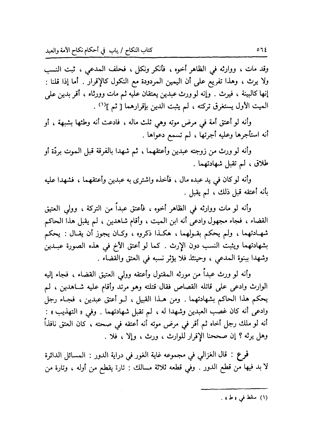 وقد مات، ووارثه في الظاهر أخوه، فأنكر ونكل، فحلف المدعي، ثبت النسب ولا يرث، وهذا تفريع على أن اليمين المردودة مع النكول كالاقرار. أما إذا قلنا: إنها كالبينة، فيرث. وإنه لو ورث عبدين يعتقان عليه ثم مات وورثاه، أقر بدين على الميت الاول يستغرق تركته، لم يثبت الدين بإقرارهما. وأنه لو أعتق أمة في مرض موته وهي ثلث ماله فادعت أنه وطئها بشبهة، أو أنه استأجرها وعليه أجرتها، لم تسمع دعواها. وأنه لو ورث من زوجته عبدين وأعتقهما، ثم شهدا بالفرقة قبل الموت بردة أو طلاق، لم تقبل شهادتهما. وأنه لو كان في يد عبده مال، فأخذه واشترى به عبدين وأعتقهما فشهدا عليه بأنه أعتقه قبل ذلك، لم يقبل. وأنه لو مات ووارثه في الظاهر أخوه، فأعتق عبدا من التركة، وولي العتيق القضاء، فجاء مجهول وادعى أنه ابن الميت، وأقام شاهدين، لم يقبل هذا الحاكم شهادتهما، ولم يحكم بقولهما، هكذا ذكروه، وكان يجوز أن يقال: يحكم بشهادتهما ويثبت النسب دون الارث. كما لو أعتق الاخ في هذه الصورة عبدين وشهدا ببنوة المدعي، وحينئذ فلا يؤثر نسبه في العتق والقضاء. وأنه لو ورث عبدا من مورثه المقتول وأعتقه وولي العتيق القضاء، فجاء إليه الوارث وادعى على قاتله القصاص فقال (قتلته) وهو مرتد وأقام عليه شاهدين، لم يحكم هذا الحاكم بشهادتهما. ومن هذا القبيل، لو أعتق عبدين، فجاء رجل وادعى أنه كان غصب العبدين وشهدا له، لم تقبل شهادتهما. وفي التهذيب أنه لو ملك رجل أخاه ثم أقر في مرض موته أنه أعتقه في صحته، كان العتق نافذا وهل يرثه ؟ إن صححنا الاقرار للوارث، ورث، وإلا، فلا. فرع قال الغزالي في مجموعه غاية الغور في دراية الدور: المسائل الدائرة لا بد فيها من قطع الدور. وفي قطعه ثلاثة مسالك: تارة يقطع من أوله، وتارة من