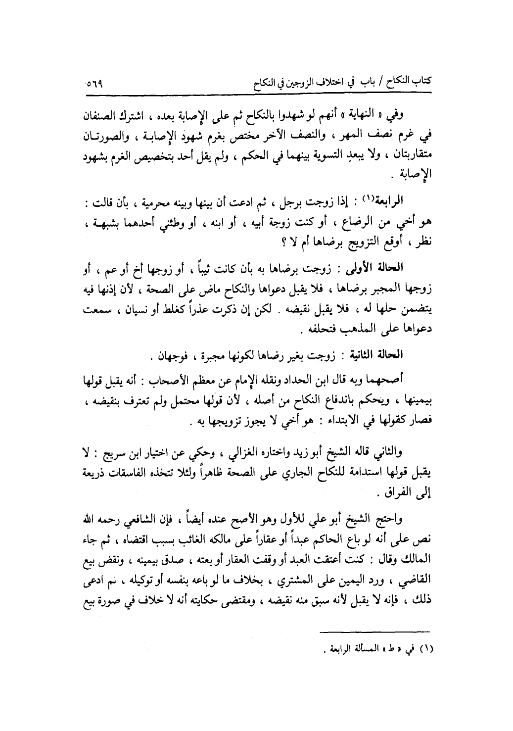 وفي النهاية أنهم لو شهدوا بالنكاح ثم على الاصابة بعده، اشترك الصنفان في غرم نصف المهر، والنصف الآخر مختص بغرم شهود الاصابة، والصورتان متقاربتان، ولا يبعد التسوية بينهما في الحكم، ولم يقل أحد بتخصيص الغرم بشهود الاصابة. المسألة الرابعة: إذا زوجت برجل، ثم ادعت أن بينها وبينه محرمية، بأن قالت: هو أخي من الرضاع، أو كنت زوجة أبيه، أو ابنه، أو وطئني أحدهما بشبهة، نظر، أوقع التزويج برضاها أم لا ؟ الحالة الاولى: زوجت برضاها به بأن كانت ثيبا، أو زوجها أخ أو عم، أو زوجها المجبر برضاها، فلا يقبل دعواها والنكاح ماض على الصحة، لان إذنها فيه يتضمن حلها له، فلا يقبل نقيضه. لكن إن ذكرت عذرا كغلط أو نسيان، سمعت دعواها على المذهب فتحلفه. الحالة الثانية: زوجت بغير رضاها لكونها مجبرة، فوجهان. أصحهما وبه قال ابن الحداد ونقله الامام عن معظم الاصحاب: أنه يقبل قولها بيمينها، ويحكم باندفاع النكاح من أصله، لان قولها محتمل ولم تعترف بنقيضه، فصار كقولها في الابتداء: هو أخي لا يجوز تزويجها به. والثاني قاله الشيخ أبو زيد واختاره الغزالي، وحكي عن اختيار ابن سريج: لا يقبل قولها استدامة للنكاح الجاري على الصحة ظاهرا ولئلا تتخذه الفاسقات ذريعة إلى الفراق. واحتج الشيخ أبو علي للاول وهو الاصح عنده أيضا، فإن الشافعي رحمه الله نص على أنه لو باع الحاكم عبدا أو عقارا على مالكه الغائب بسبب اقتضاه، ثم جاء المالك وقال: كنت أعتقت العبد أو وقفت العقار أو بعته، صدق بيمينه، ونقض بيع القاضي، ورد اليمين على المشتري، بخلاف ما لو باعه بنفسه أو توكيله، ثم ادعى ذلك، فإنه لا يقبل لانه سبق منه نقيضه، ومقتضى حكايته أنه لا خلاف في صورة بيع