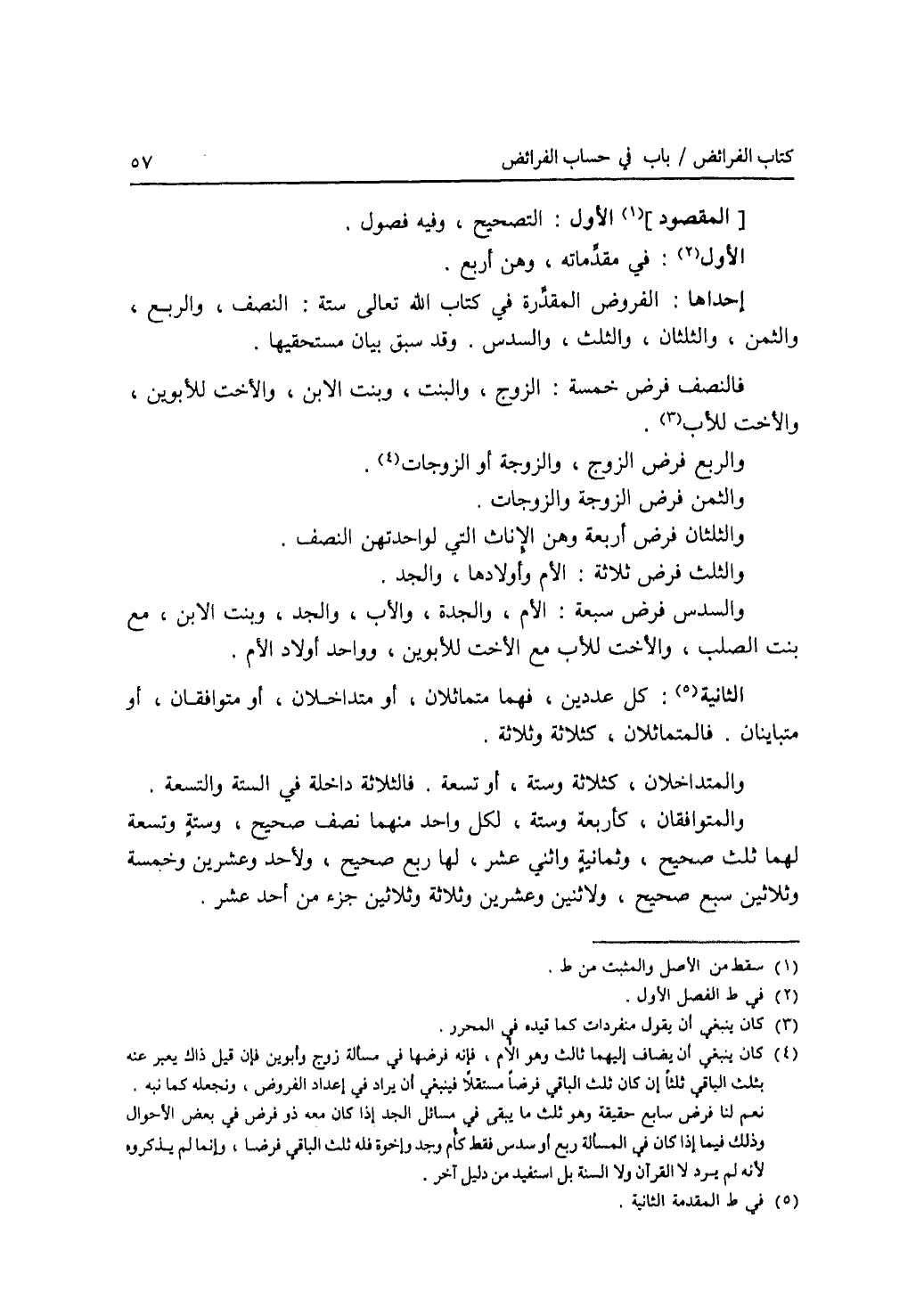 الفصل الاول : في مقدماته، وهن أربع. إحداها: الفروض المقدرة في كتاب الله تعالى ستة: النصف، والربع، والثمن، والثلثان، والثلث، والسدس. وقد سبق بيان مستحقيها. فالنصف فرض خمسة: الزوج، والبنت، وبنت الابن، والاخت للابوين، والاخت للاب. والربع فرض الزوج، والزوجة أو الزوجات. والثمن فرض الزوجة والزوجات. والثلثان فرض أربعة وهن الاناث التي لواحدتهن النصف. والثلث فرض ثلاثة: الام وأولادها، والجد. والسدس فرض سبعة: الام، والجدة، والاب، والجد، وبنت الابن، مع بنت الصلب، والاخت للاب مع الاخت للابوين، وواحد أولاد الام. (المقدمة) الثانية: كل عددين، فهما متماثلان، أو متداخلان، أو متوافقان، أو متباينان. فالمتماثلان، كثلاثة وثلاثة. والمتداخلان، كثلاثة وستة، أو تسعة. فالثلاثة داخلة في الستة والتسعة. والمتوافقان، كأربعة وستة، لكل واحد منهما نصف صحيح، وستة وتسعة لهما ثلث صحيح، وثمانية واثني عشر لهما ربع صحيح ولاحد وعشرين وخمسة وثلاثين سبع صحيح، ولاثنين وعشرين وثلاثة وثلاثين جزء من أحد عشر.