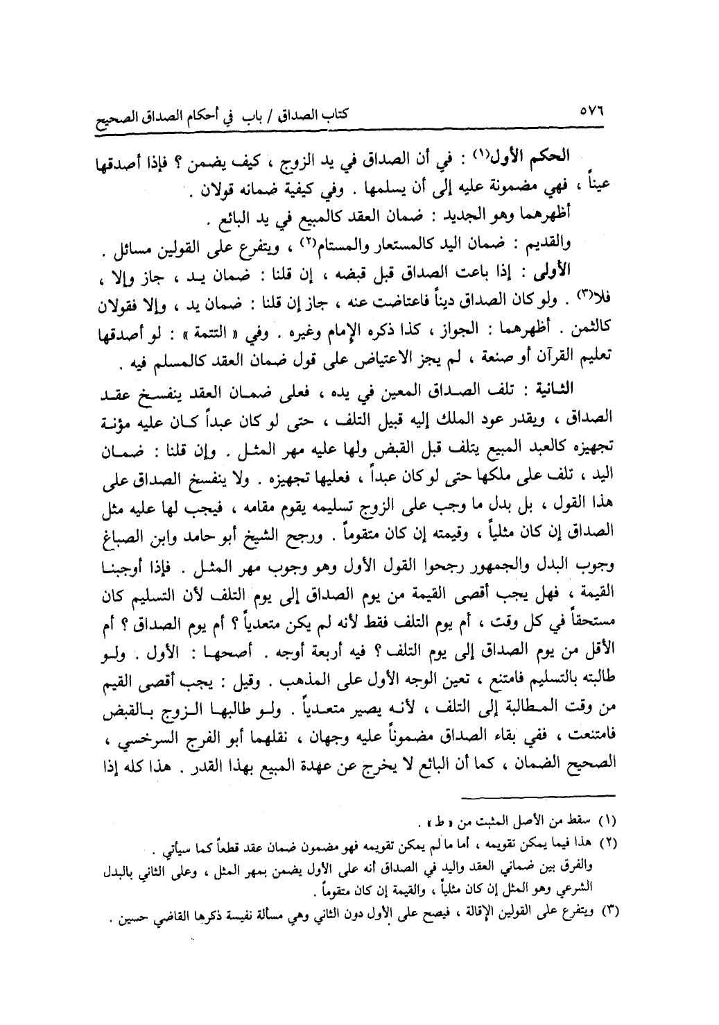 الحكم الأول : في أن الصداق في يد الزوج كيف يضمن ؟ فإذا أصدقها عينا، فهي مضمونة عليه إلى أن يسلمها. وفي كيف يضمانه قولان. أظهرهما وهو الجديد: ضمان العقد كالمبيع في يد البائع. والقديم: ضمان اليد كالمستعار والمستام، ويتفرع على القولين مسائل. (المسألة) الاولى: إذا باعت الصداق قبل قبضه، إن قلنا: ضمان يد، جاز وإلا، فلا. ولو كان الصداق دينا فاعتاضت عنه، جاز إن قلنا: ضمان يد، وإلا فقولان كالثمن. أظهرهما: الجواز، كذا ذكره الامام وغيره. وفي التتمة: لو أصدقها تعليم القرآن أو صنعة، لم يجز الاعتياض على قول ضمان العقد كالمسلم فيه. (المسألة) الثانية: تلف الصداق المعين في يده، فعلى ضمان العقد ينفسخ عقد الصداق، ويقدر عود الملك إليه قبيل التلف، حتى لو كان عبدا كان عليه مؤنة تجهيزه كالعبد المبيع يتلف قبل القبض ولها عليه مهر المثل. وإن قلنا: ضمان اليد، تلف على ملكها حتى لو كان عبدا، فعليها تجهيزه. ولا ينفسخ الصداق على هذا القول، بل بدل ما وجب على الزوج تسليمه يقوم مقامه، فيجب لها عليه مثل الصداق إن كان مثليا، وقيمته إن كان متقوما. ورجح الشيخ أبو حامد وابن الصباغ وجوب البدل، والجمهور رجحوا القول الاول وهو وجوب مهر المثل. فإذا أوجبنا القيمة، فهل يجب أقصى القيمة من يوم الصداق إلى يوم التلف لان التسليم كان مستحقا في كل وقت، أم يوم التلف فقط لانه لم يكن متعديا ؟ أم يوم الصداق ؟ أم الاقل من يوم الصداق إلى يوم التلف ؟ فيه أربعة أوجه. أصحهما: الاول. ولو طالبته بالتسليم فامتنع، تعين الوجه الاول على المذهب. وقيل: يجب أقصى القيم من وقت المطالبة إلى التلف، لانه يصير متعديا. ولو طالبها الزوج بالقبض فامتنعت، ففي بقاء الصداق مضمونا عليه وجهان، نقلهما أبو الفرج السرخسي، الصحيح الضمان، كما أن البائع لا يخرج عن عهدة المبيع بهذا القدر. هذا كله إذا
